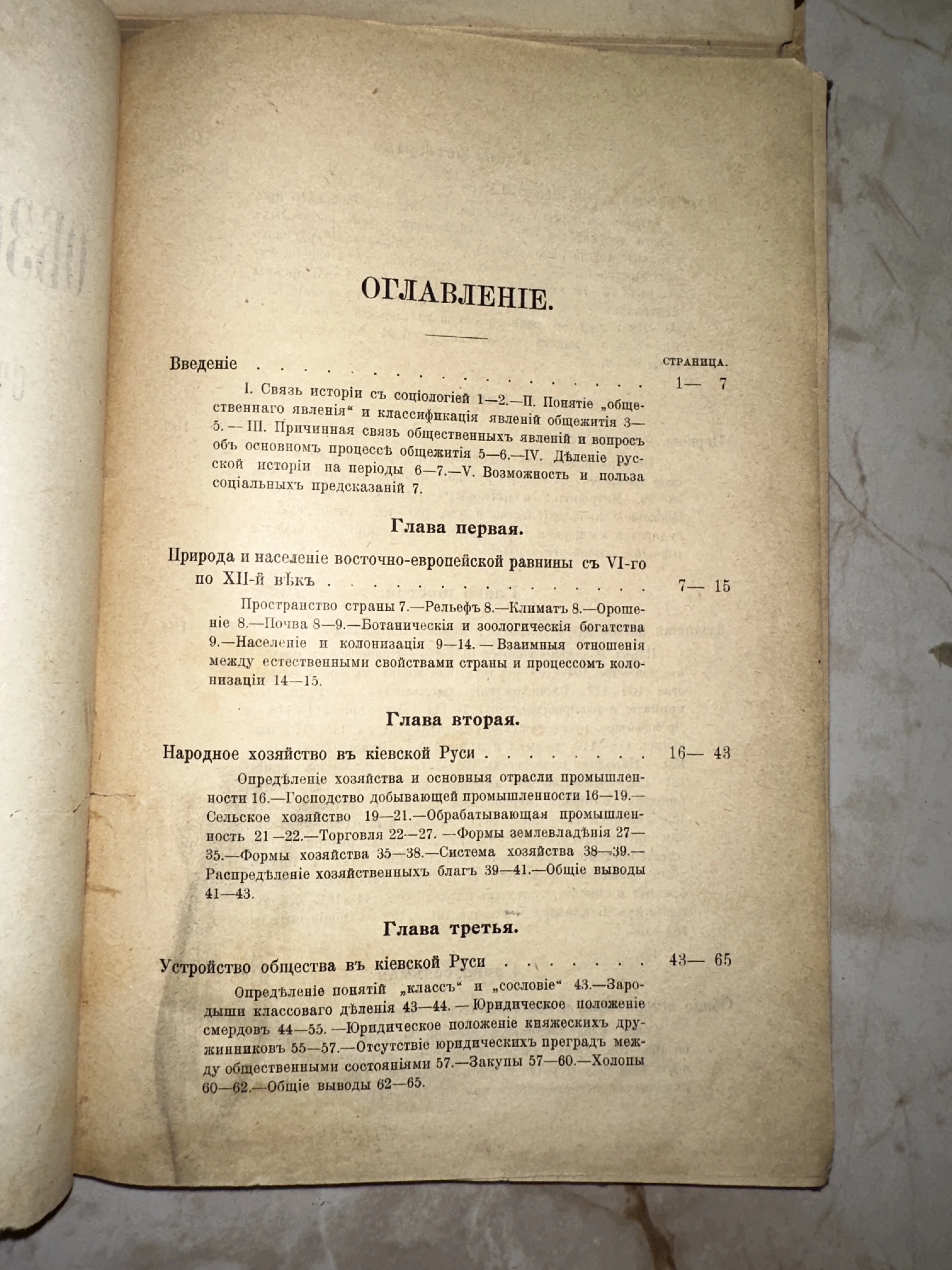 Перед вами страница оглавления редкого исторического труда, напечатанного в дореволюционной орфографии на благородно состаренной бумаге. Текст охватывает фундаментальные темы — от географии Восточно-Европейской равнины до социально-экономического устройства Киевской Руси. Четкая типографика и академический стиль изложения делают это издание ценным артефактом для любителей серьезной исторической литературы.