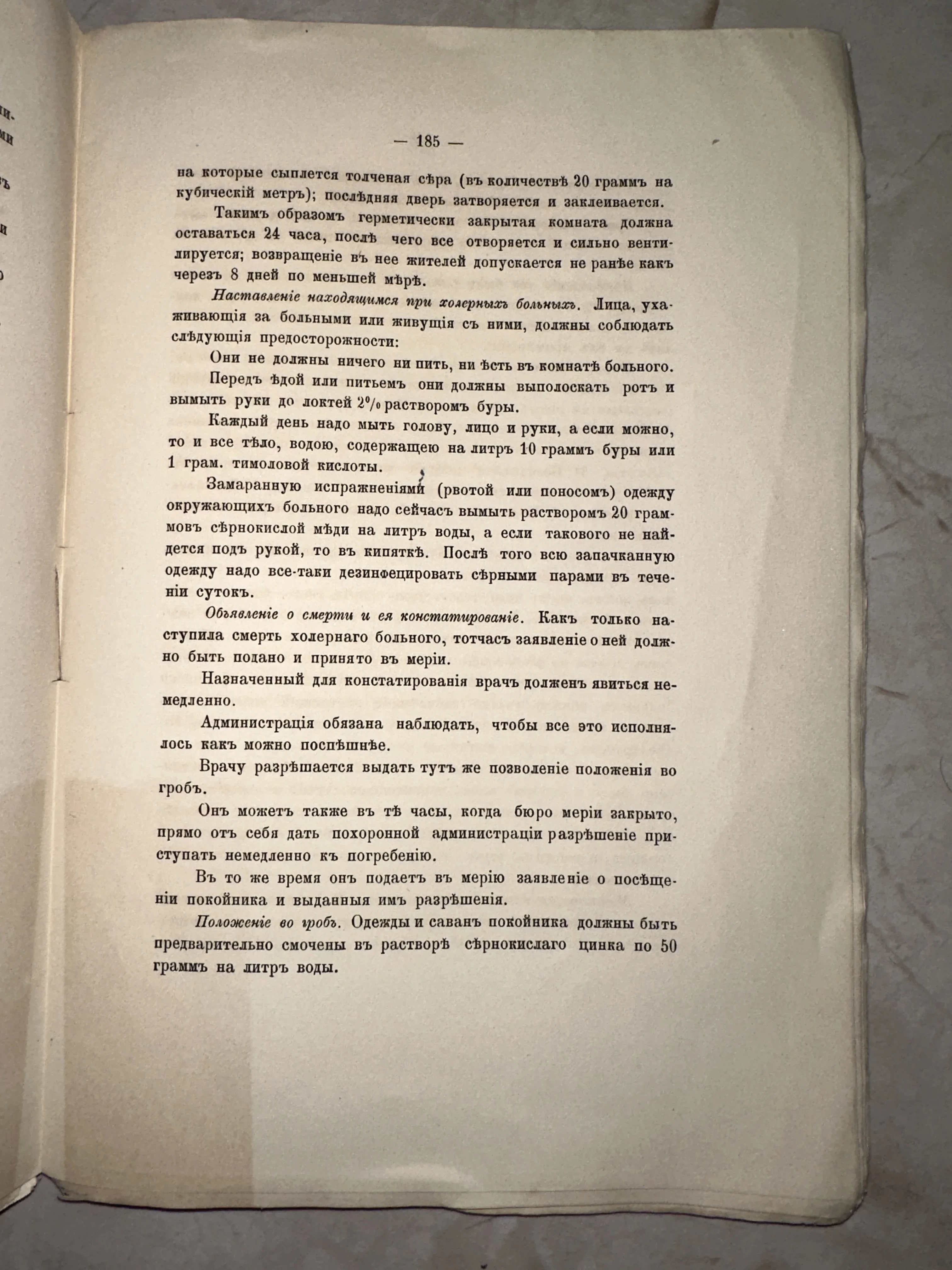Страница антикварного медицинского руководства: инструкции по борьбе с холерой