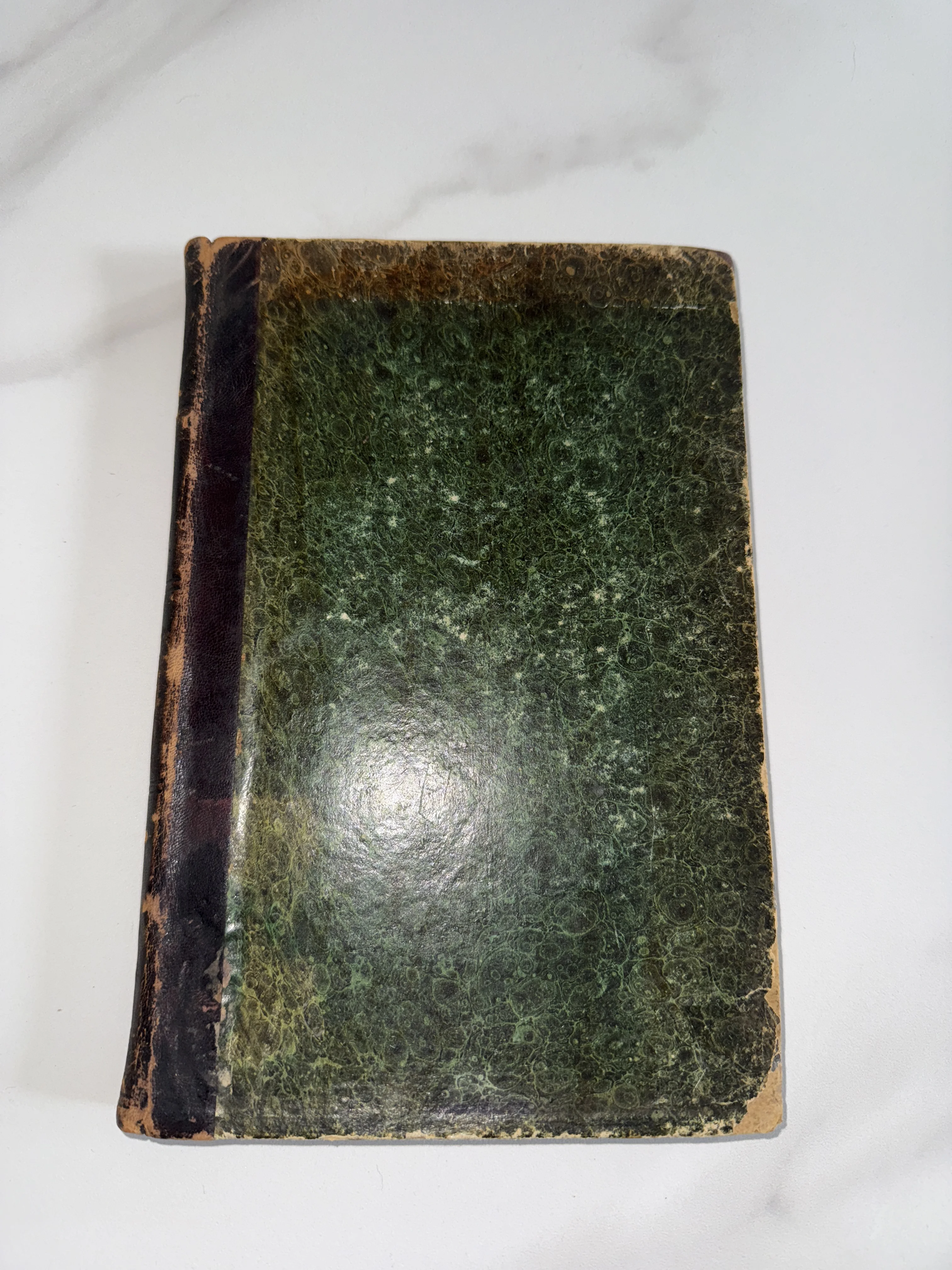 Этот антикварный том очаровывает своей аутентичностью: обложка украшена классическим узором «мраморной» бумаги в глубоких зеленых тонах. Благородная патина и характерные потертости по краям свидетельствуют о долгой истории предмета, превращая книгу в ценный экземпляр для частной коллекции.