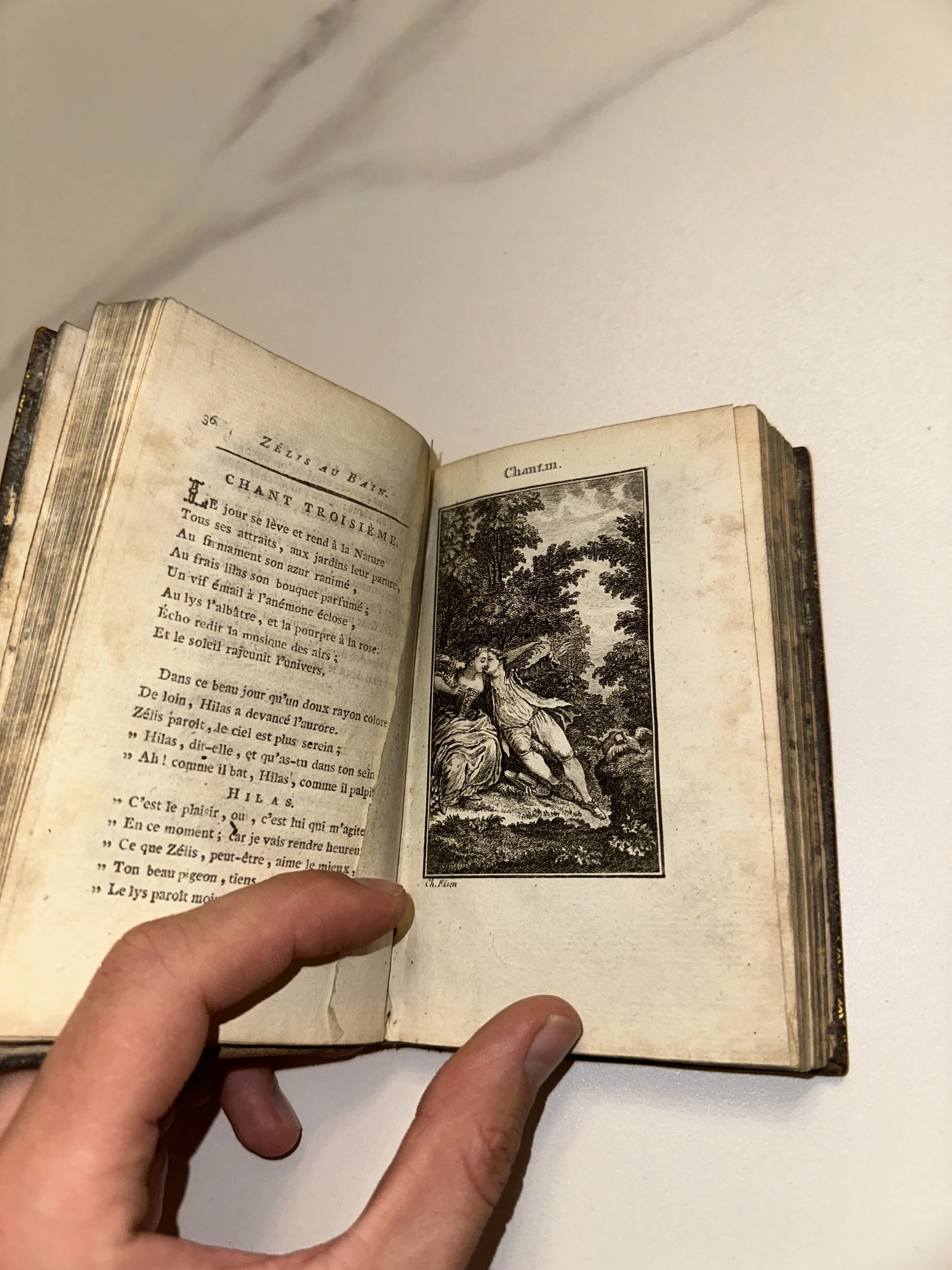 Изящное малоформатное издание эпохи Просвещения, украшенное тончайшей гравюрой знаменитого мастера Шарля Эйзена. Пожелтевшие страницы с характерной типографикой и аутентичной патиной времени переносят в атмосферу галантного века, делая этот экземпляр ценным приобретением для истинного библиофила.