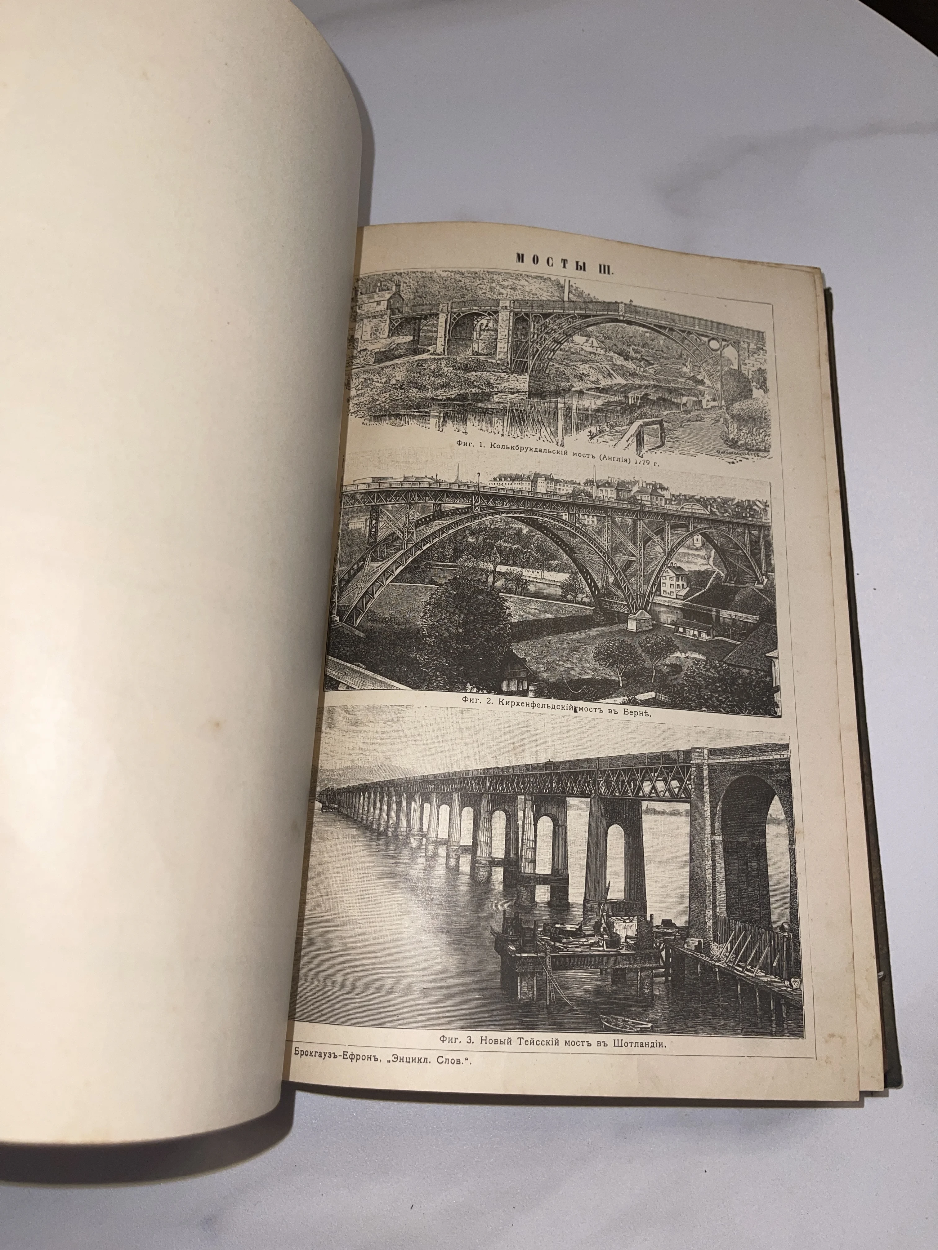 Разворот старинной энциклопедии с черно-белыми гравюрами трех европейских мостов: Колькобрукдальского, Кирхенфельдского и Нового Тейского.