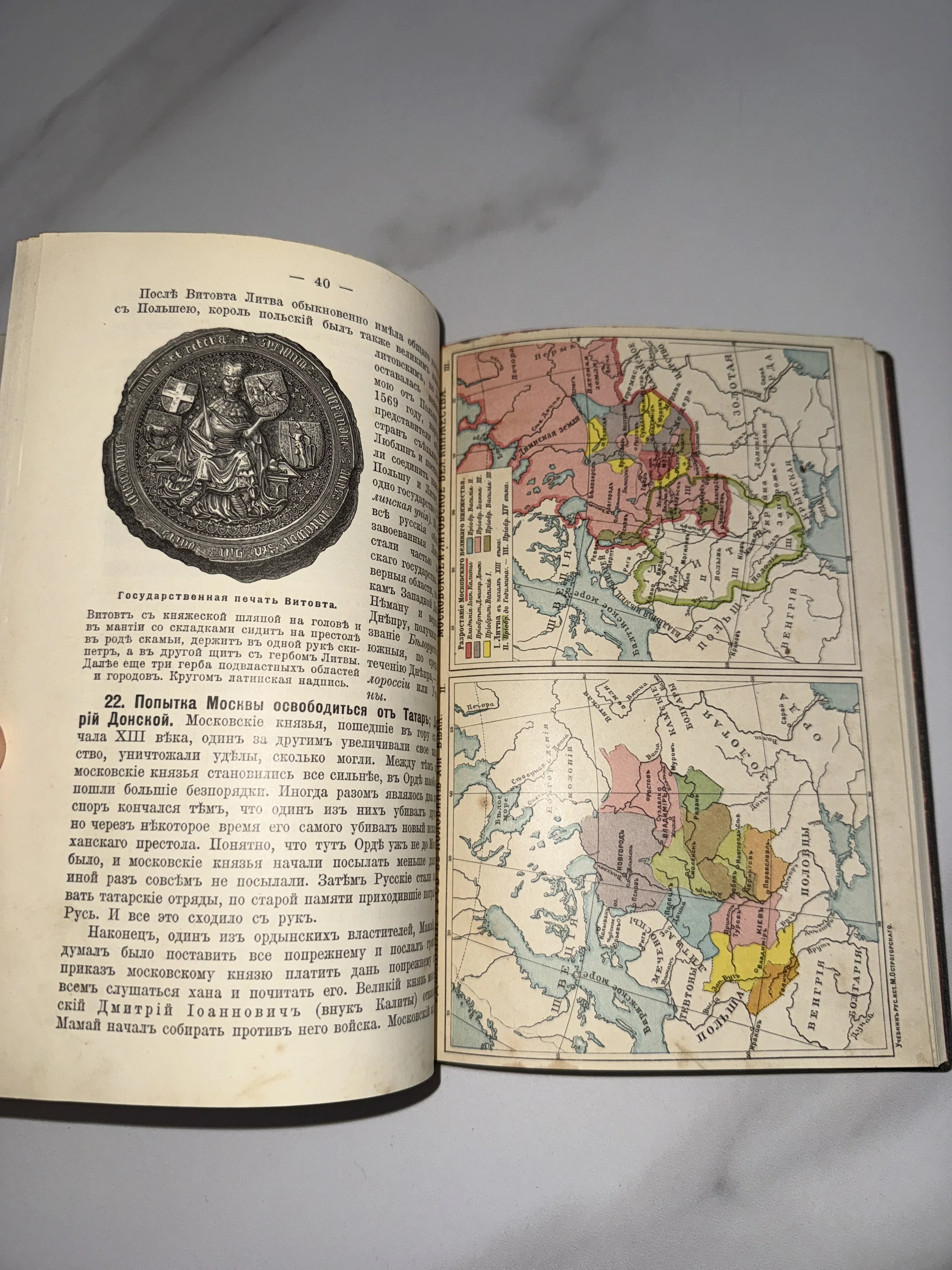 Редкий экземпляр учебника русской истории М. Острогорского с прекрасно сохранившимися цветными картами и иллюстрациями. На развороте представлена государственная печать Витовта и детальные схемы территориальных изменений Руси. Бумага сохранила приятный винтажный оттенок, а типографская печать остается четкой и насыщенной.