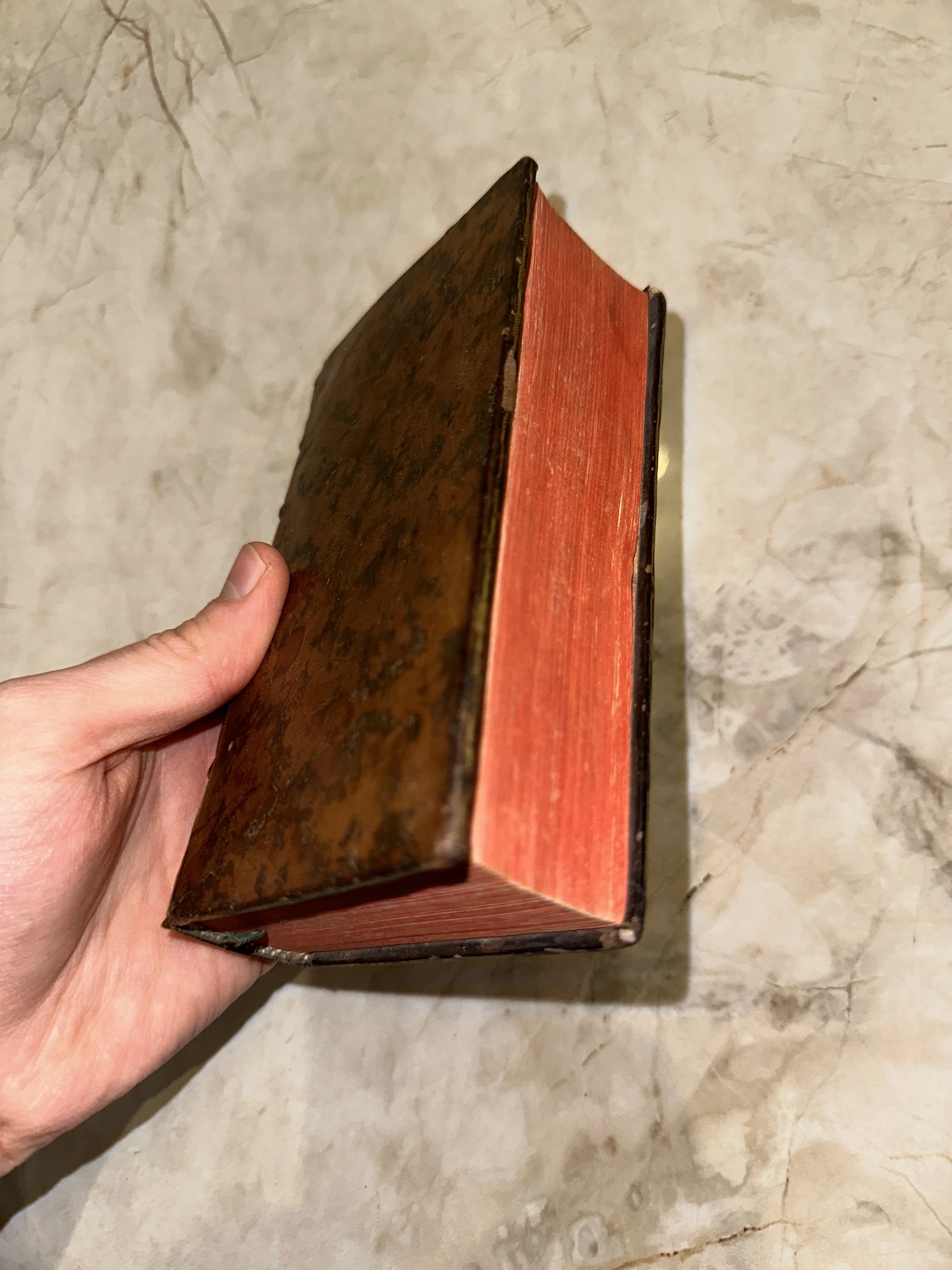 Рука держит старинную книгу в потертом коричневом переплете с окрашенным красным обрезом страниц на светлом фоне.