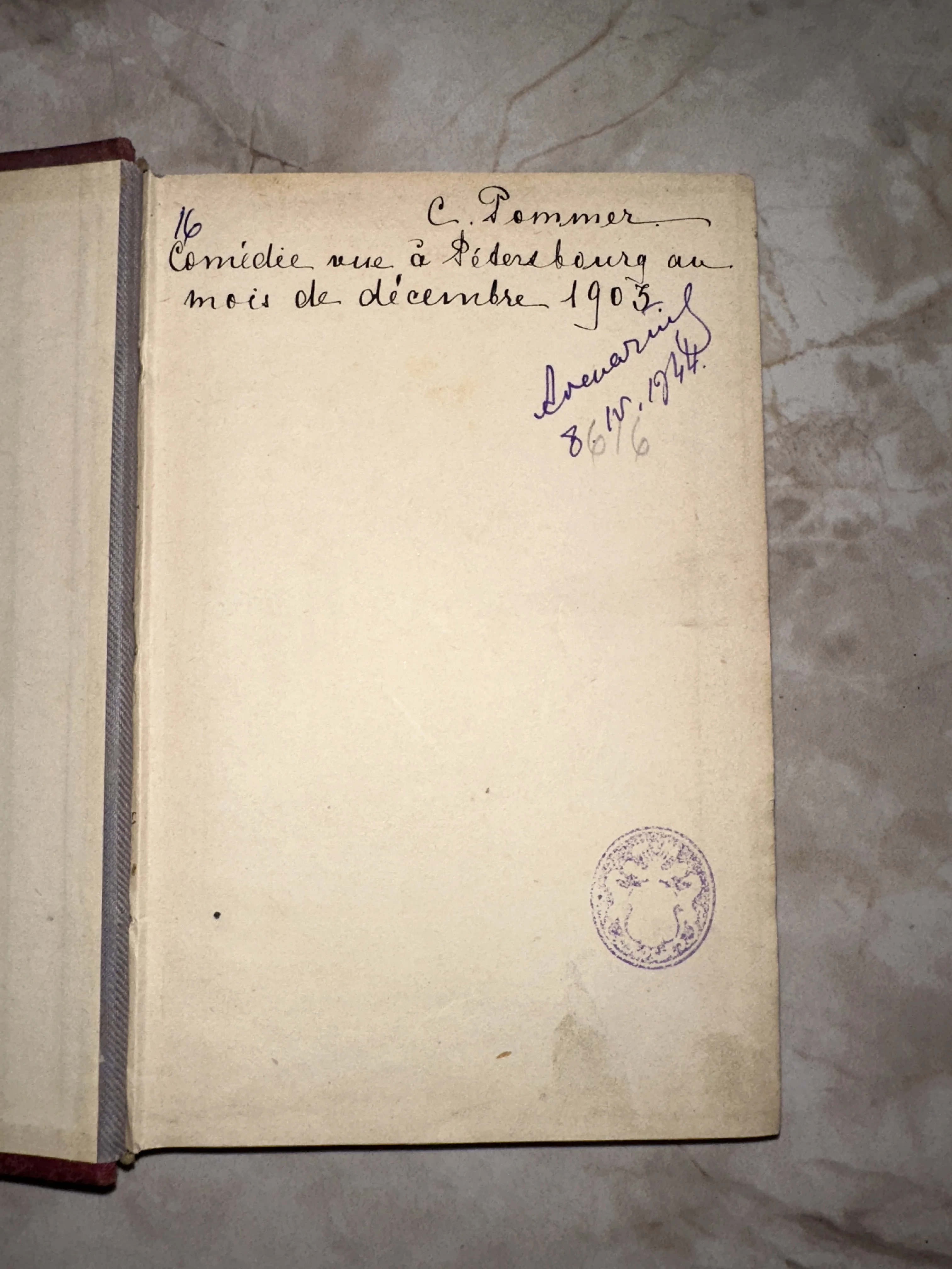 Уникальный артефакт с живой историей: изящная французская каллиграфия повествует о комедии, увиденной в Петербурге в декабре 1903 года. На благородно состаренной бумаге сохранились следы времени, более поздние пометки 1944 года и аутентичный оттиск печати, придающие предмету особую коллекционную ценность.