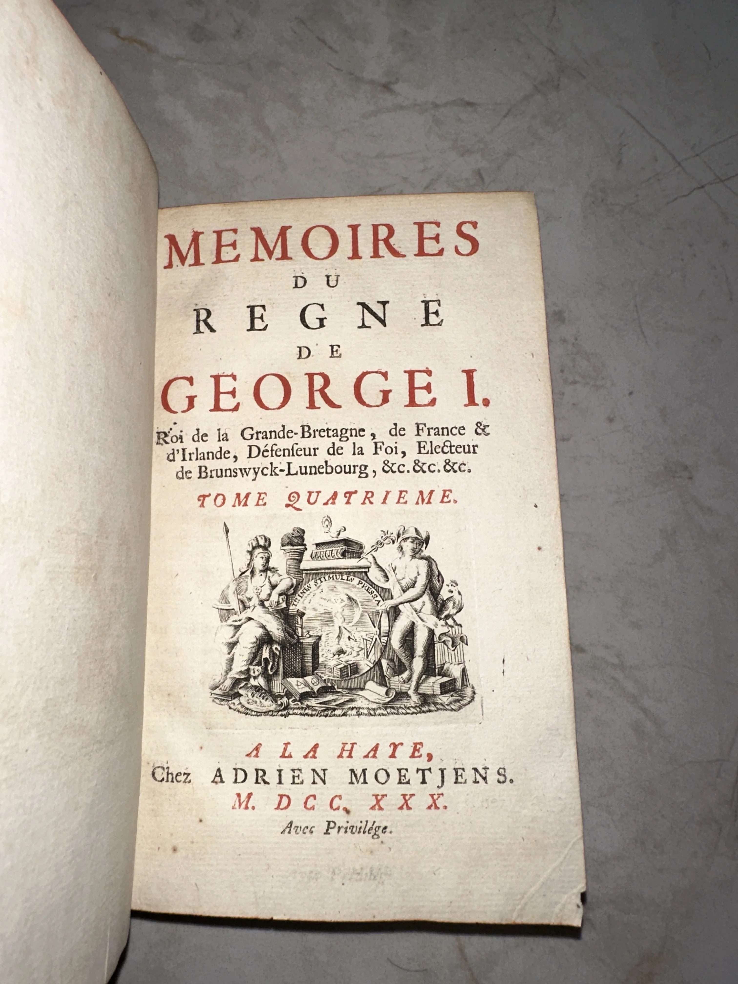 Изысканный четвертый том исторического труда, изданный в Гааге в эпоху Просвещения. Страница украшена великолепной аллегорической виньеткой и классической типографикой, сохранившей четкость линий спустя почти три столетия. Это издание представляет высокую коллекционную ценность для ценителей европейской истории и старинного печатного искусства.