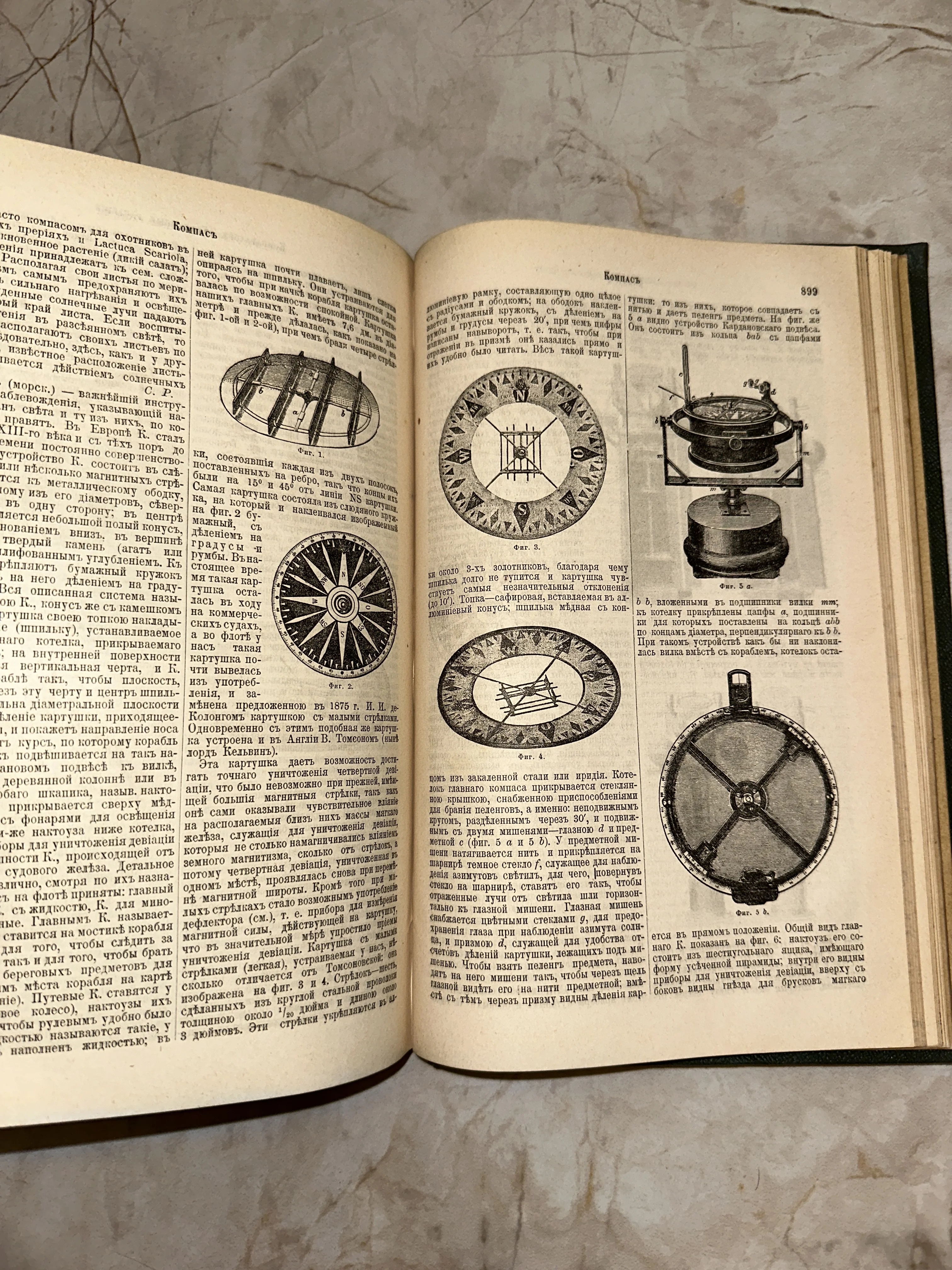 Уникальный фрагмент старинной энциклопедии, посвященный навигационному искусству и устройству компасов. Тщательно проработанные чертежи и аутентичная типографика конца XIX — начала XX века создают неповторимую атмосферу научного поиска. Отличное коллекционное состояние с характерным благородным пожелтением страниц.