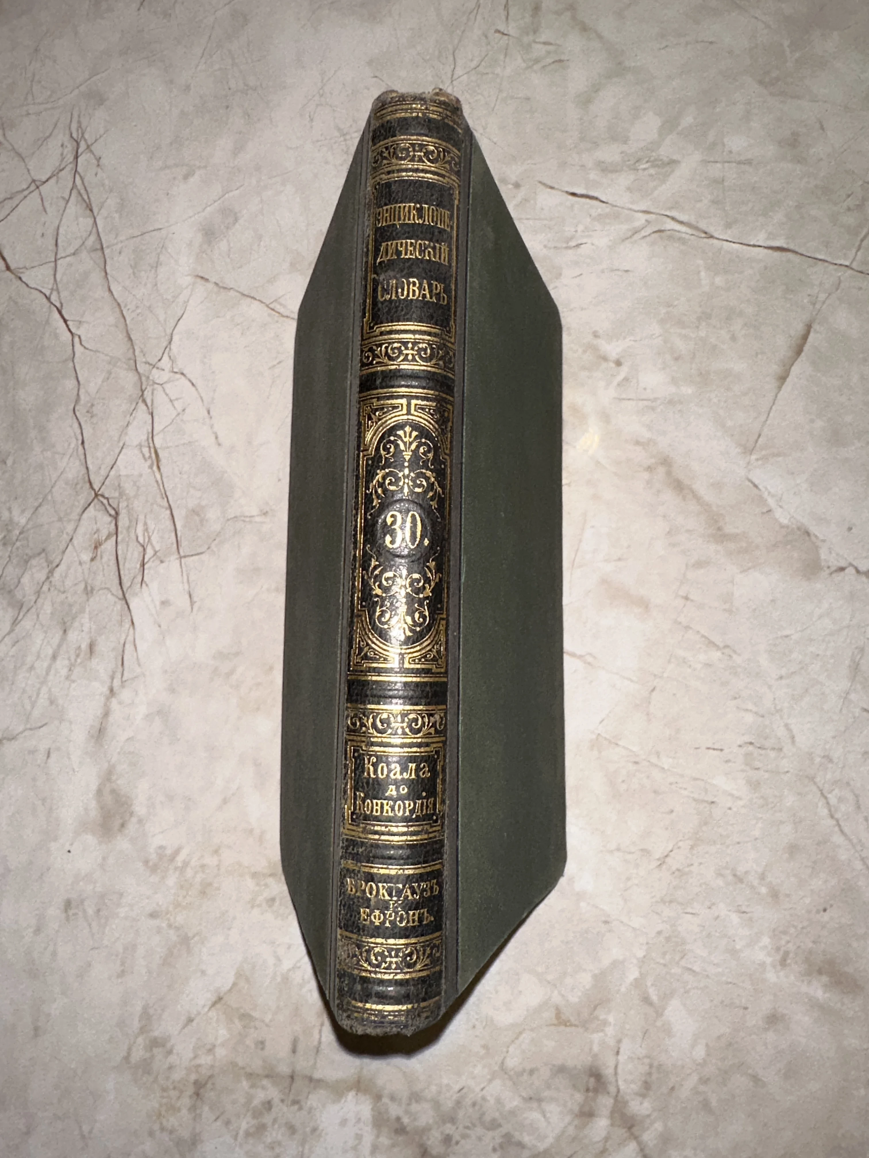 Классика русского книгоиздания — тридцатый том знаменитой энциклопедии Брокгауза и Ефрона, охватывающий статьи от «Коала» до «Конкордия». Корешок украшен изысканным золотым тиснением, которое сохранило свой блеск, несмотря на благородные следы времени. Это издание представляет собой не только историческую ценность, но и великолепный образец переплетного искусства конца XIX века.