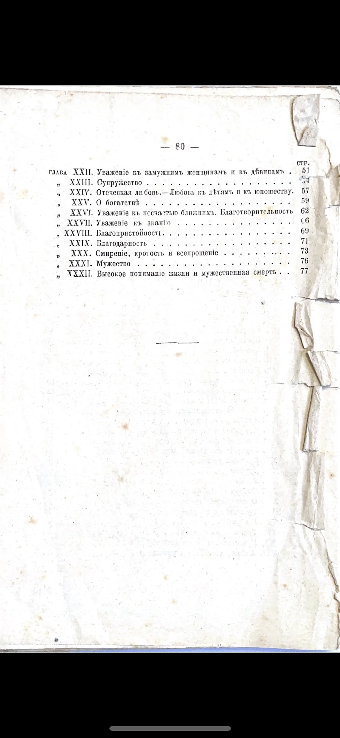 Страница 80 антикварной книги с перечнем глав на дореволюционном русском языке. Видны следы времени и потертости.