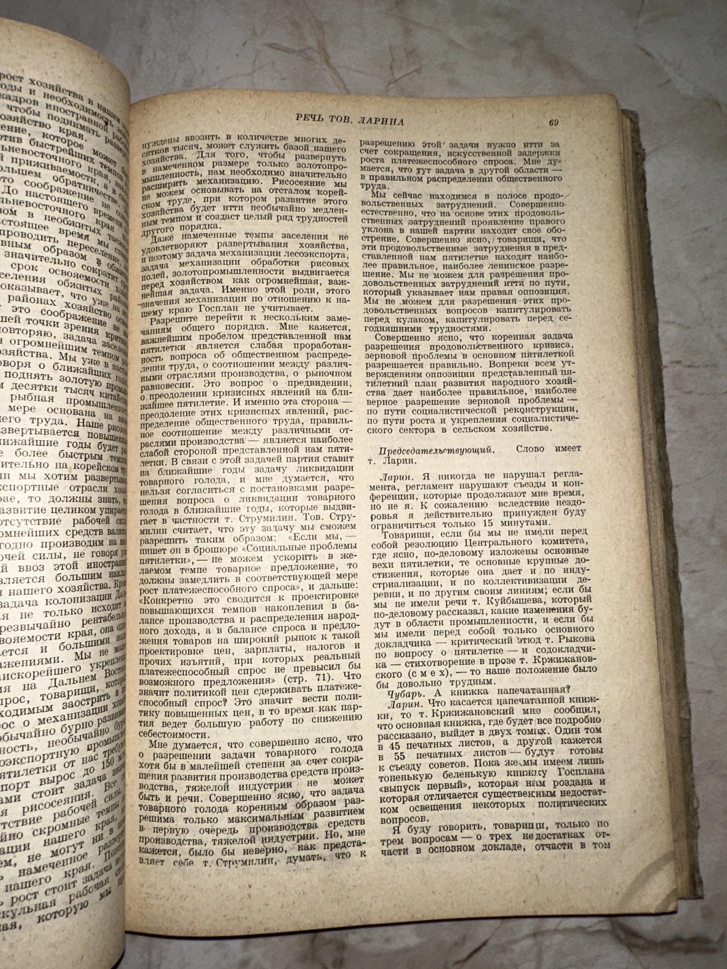 Уникальное свидетельство раннесоветской эпохи, представляющее собой печатный отчет о дискуссиях по вопросам индустриализации и сельского хозяйства. Характерная патина времени на страницах и архаичная верстка подчеркивают историческую значимость документа. Идеальное дополнение к библиотеке редких изданий XX века.