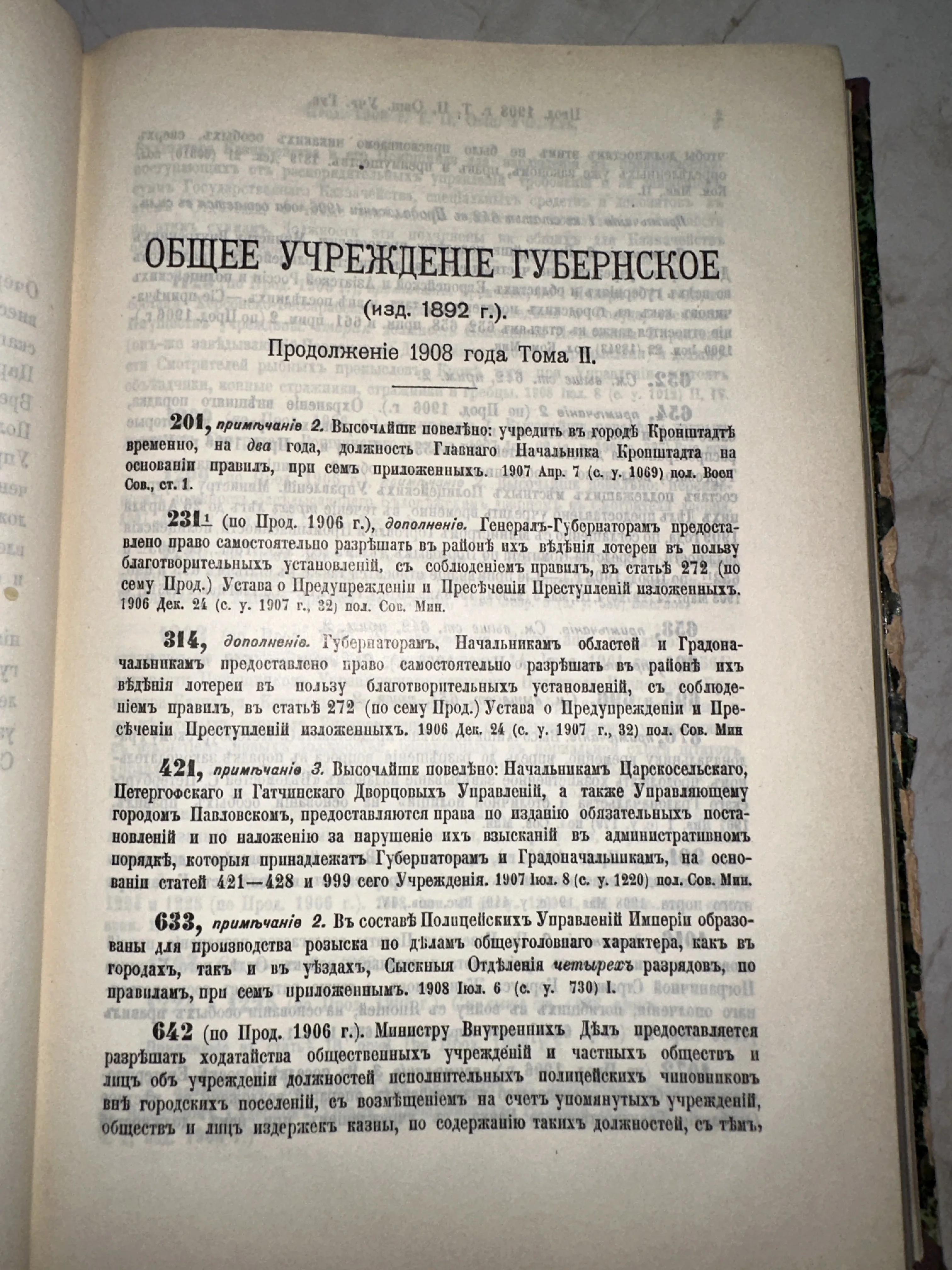 Уникальный образец дореволюционной юридической литературы, регламентирующий административное устройство Российской империи. Страница сохранила благородную патину времени и четкость дореформенного шрифта, погружая в атмосферу государственного управления начала XX века. Идеальный предмет для коллекционеров правовой истории и любителей антикварной букинистики.