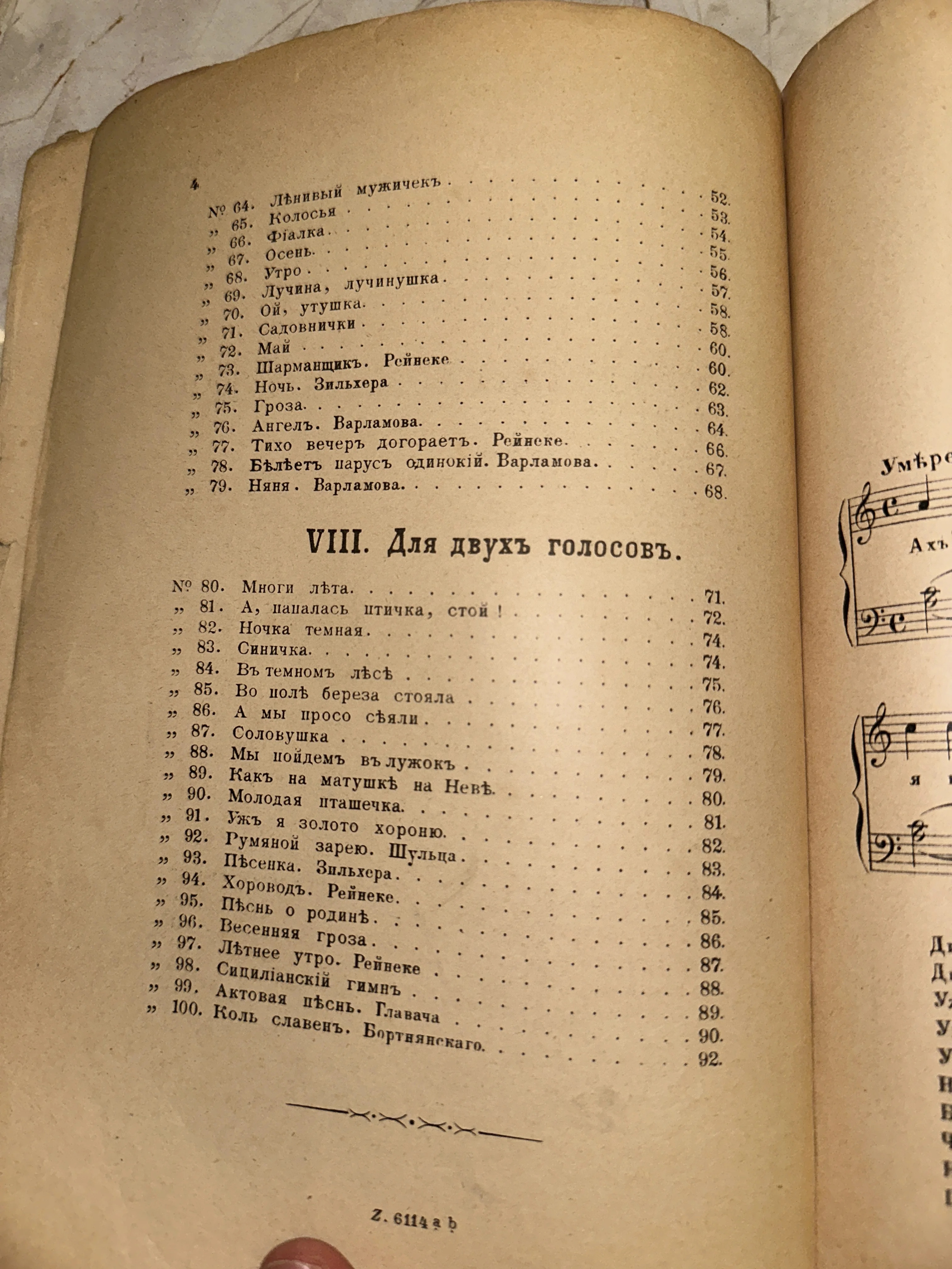 Разворот старинной книги с оглавлением вокальных произведений и фрагментом нотной грамоты на пожелтевшей бумаге.