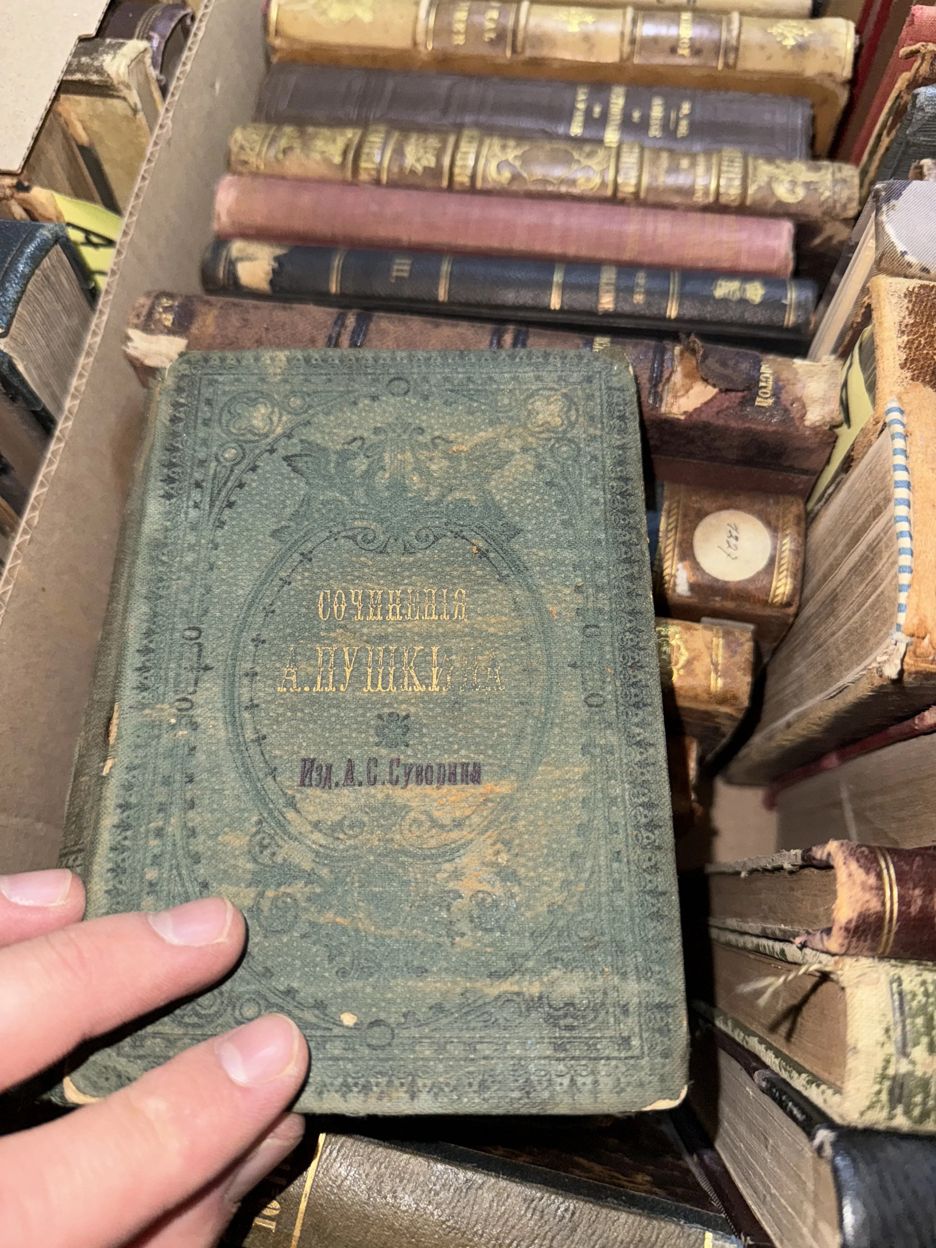 Старинная книга в зеленом тканевом переплете с золотым тиснением «Сочинения А. Пушкина», издание А. С. Суворина, в коробке с другими антикварными книгами.