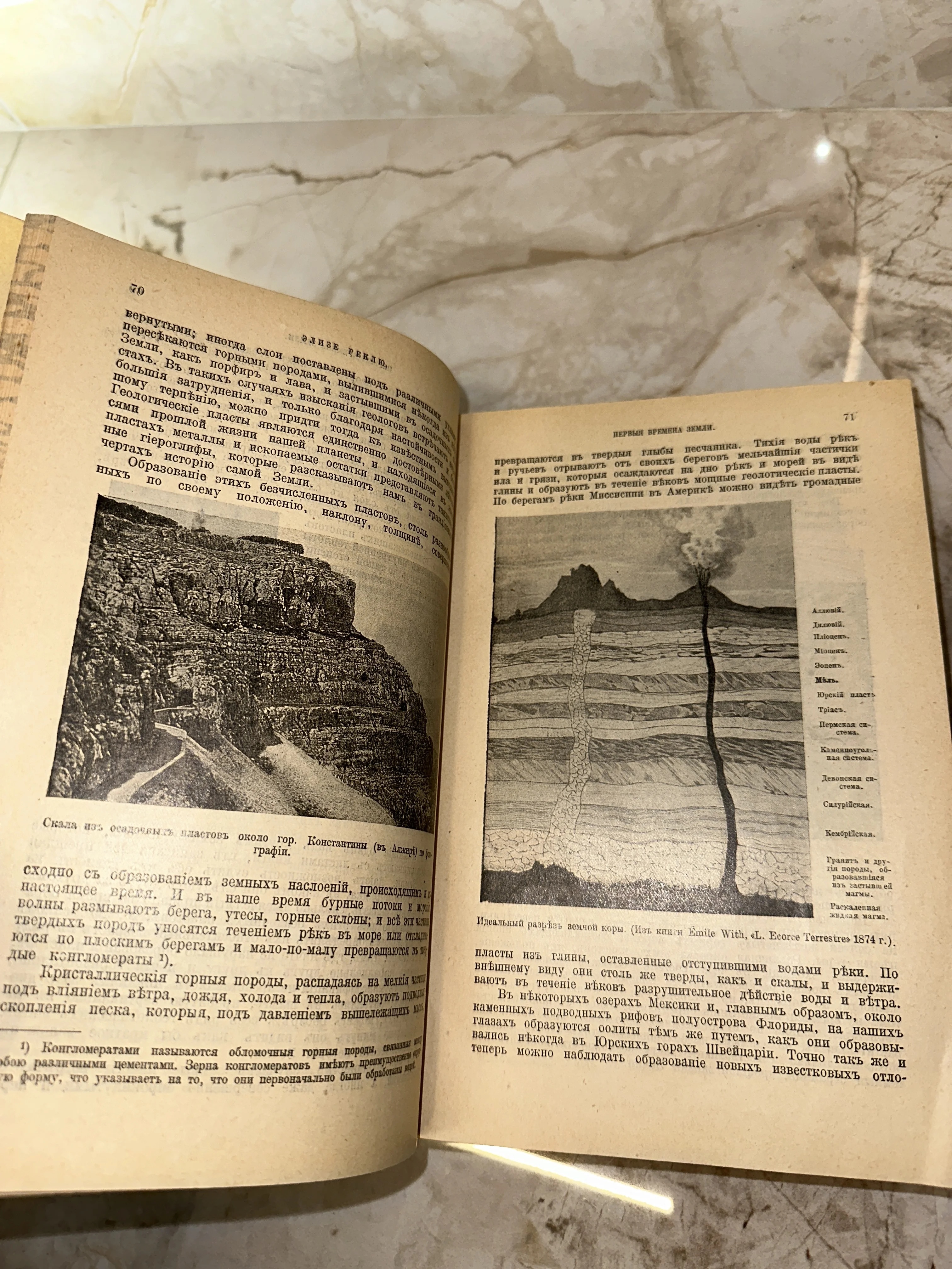 Перед вами уникальный разворот из сочинения знаменитого географа Элизе Реклю, посвященного первым эпохам существования Земли. Книга наполнена детальными гравюрами и схемами, а пожелтевшие страницы с дореволюционной орфографией передают подлинную атмосферу научных кабинетов XIX столетия. Прекрасный коллекционный экземпляр, демонстрирующий высокий уровень полиграфии и глубину естественнонаучных знаний прошлого.