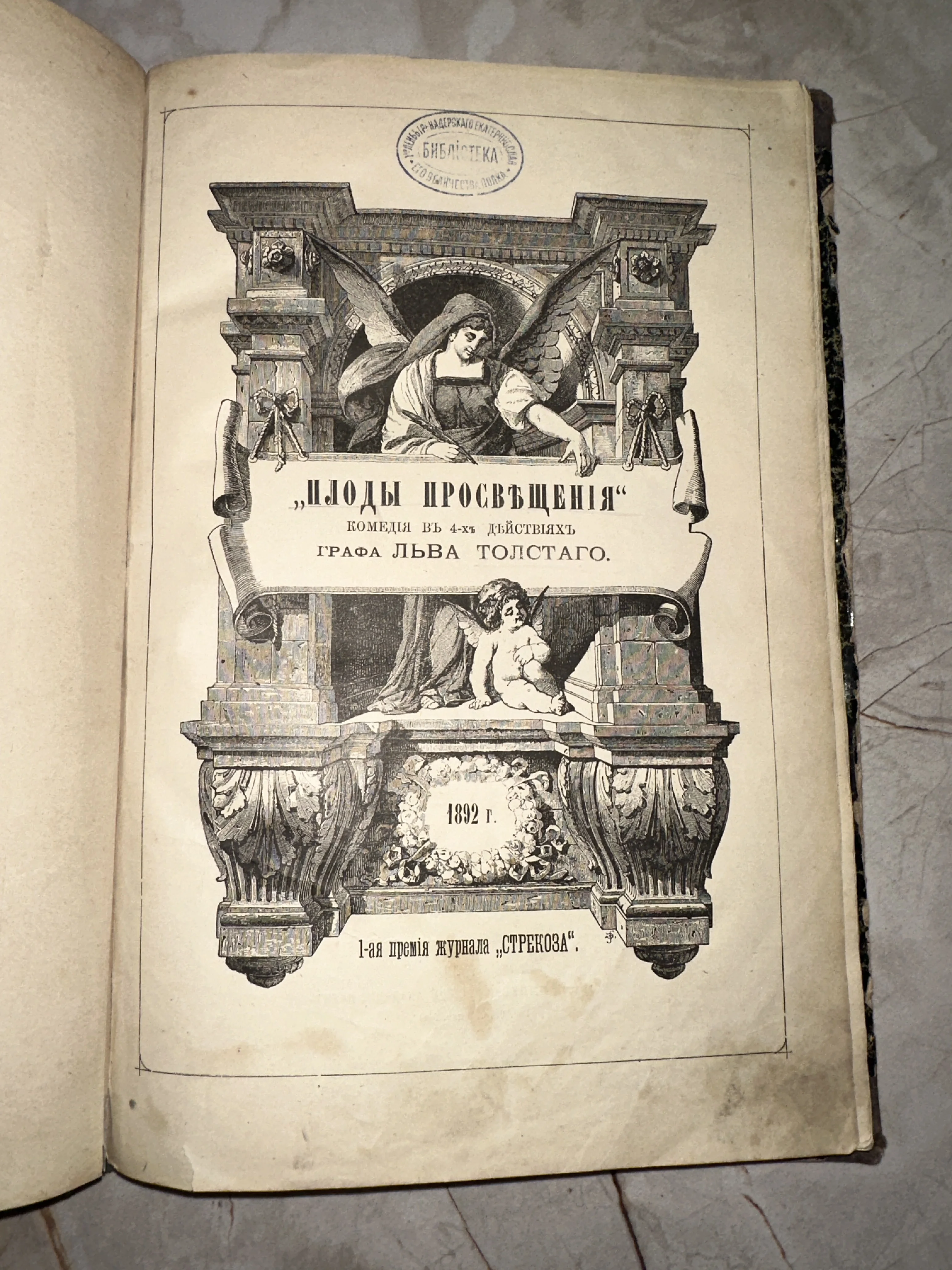 Старинный титульный лист книги Льва Толстого «Плоды просвещения» с аллегорической гравюрой и библиотечным штампом.