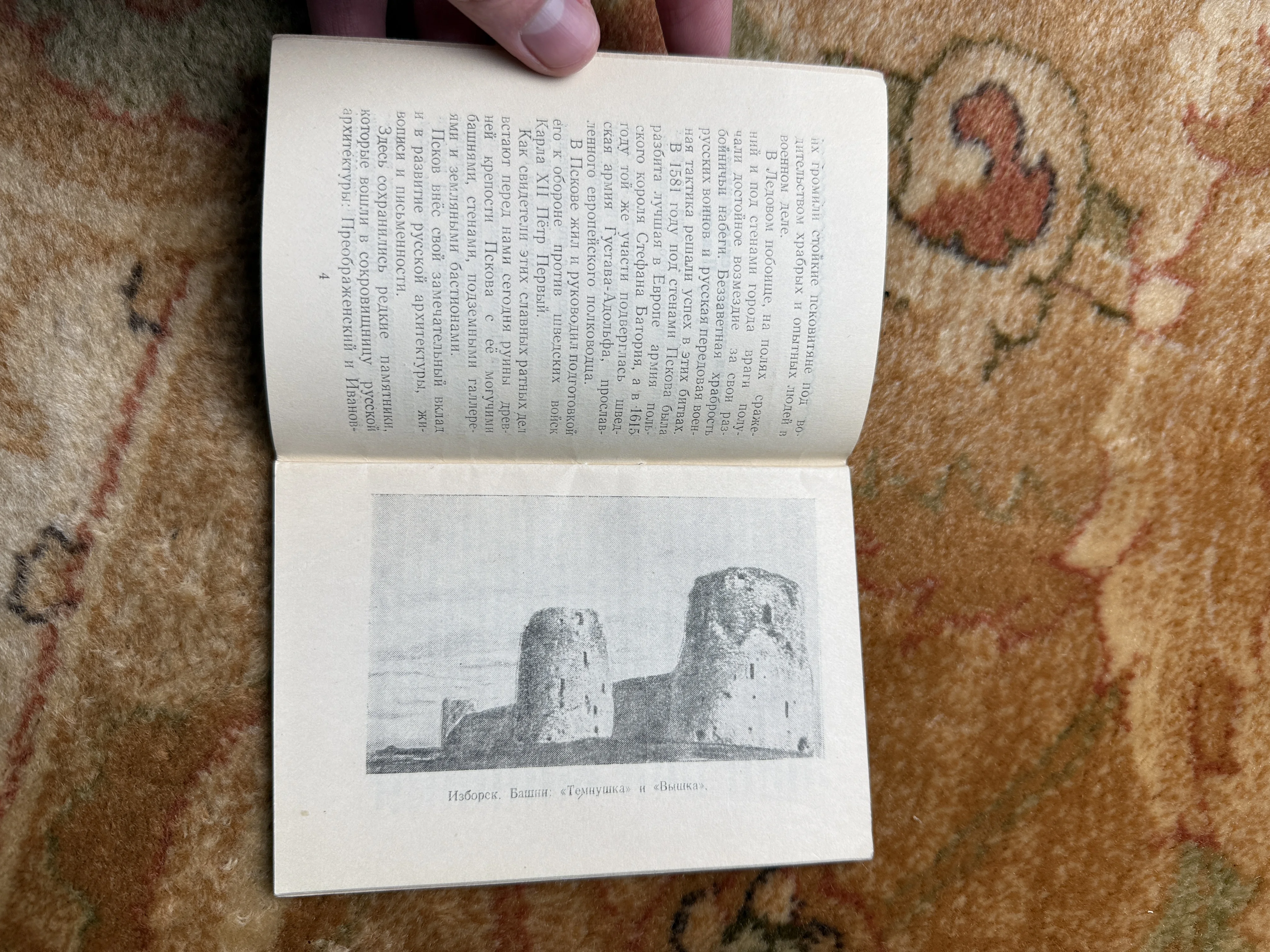 Открытая книга с текстом на русском языке и черно-белой иллюстрацией крепостных башен «Темнушка» и «Вышка» в Изборске.