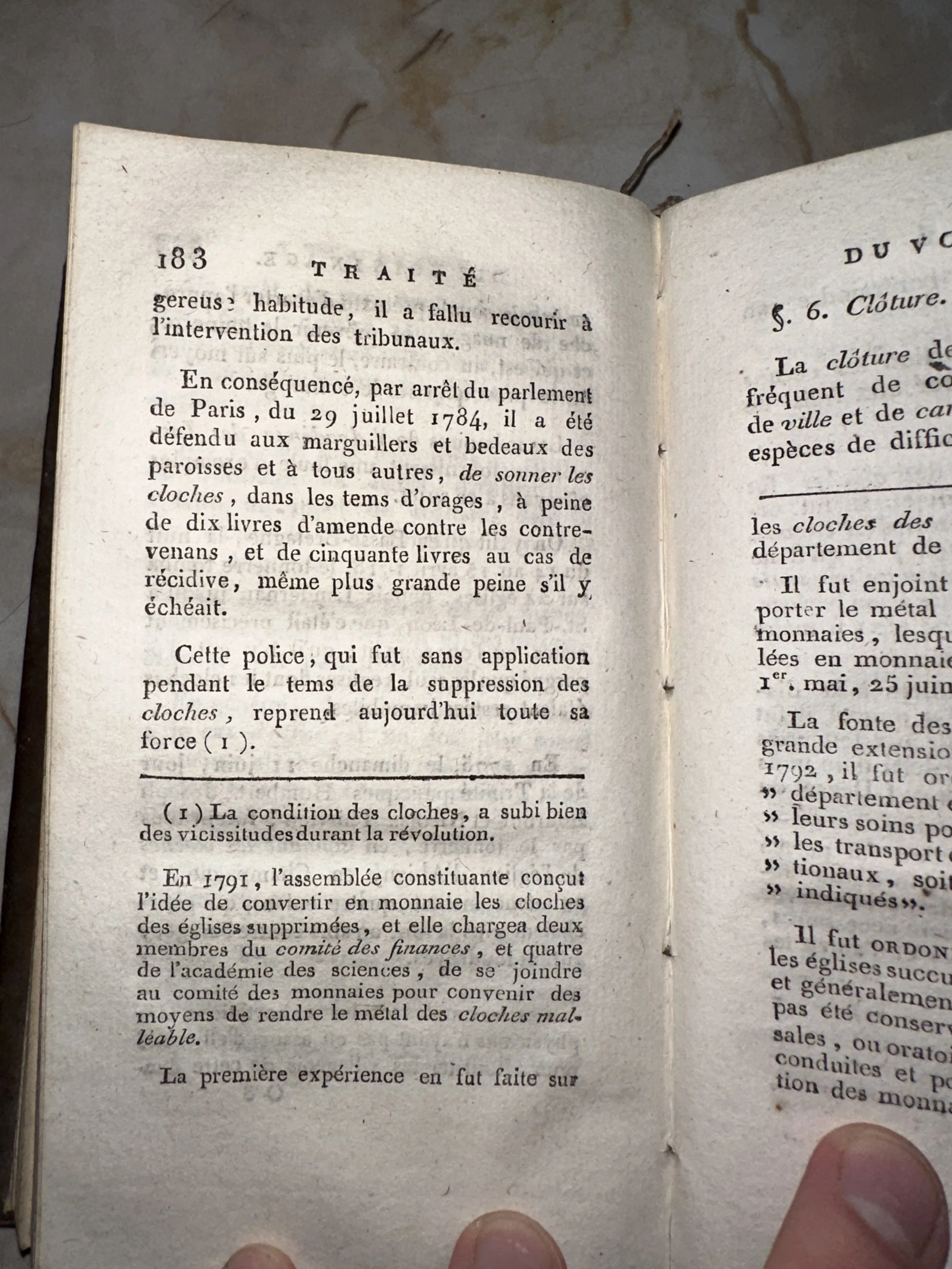 Уникальный образец книгопечатания конца XVIII века, содержащий текст о судьбе церковных колоколов в бурные годы Французской революции. Пожелтевшая бумага с характерной фактурой и сохранившиеся следы ручного переплета передают подлинный дух истории. Четкий оттиск антиквы и упоминание знаковых дат делают этот фрагмент ценным объектом для коллекционеров и историков.