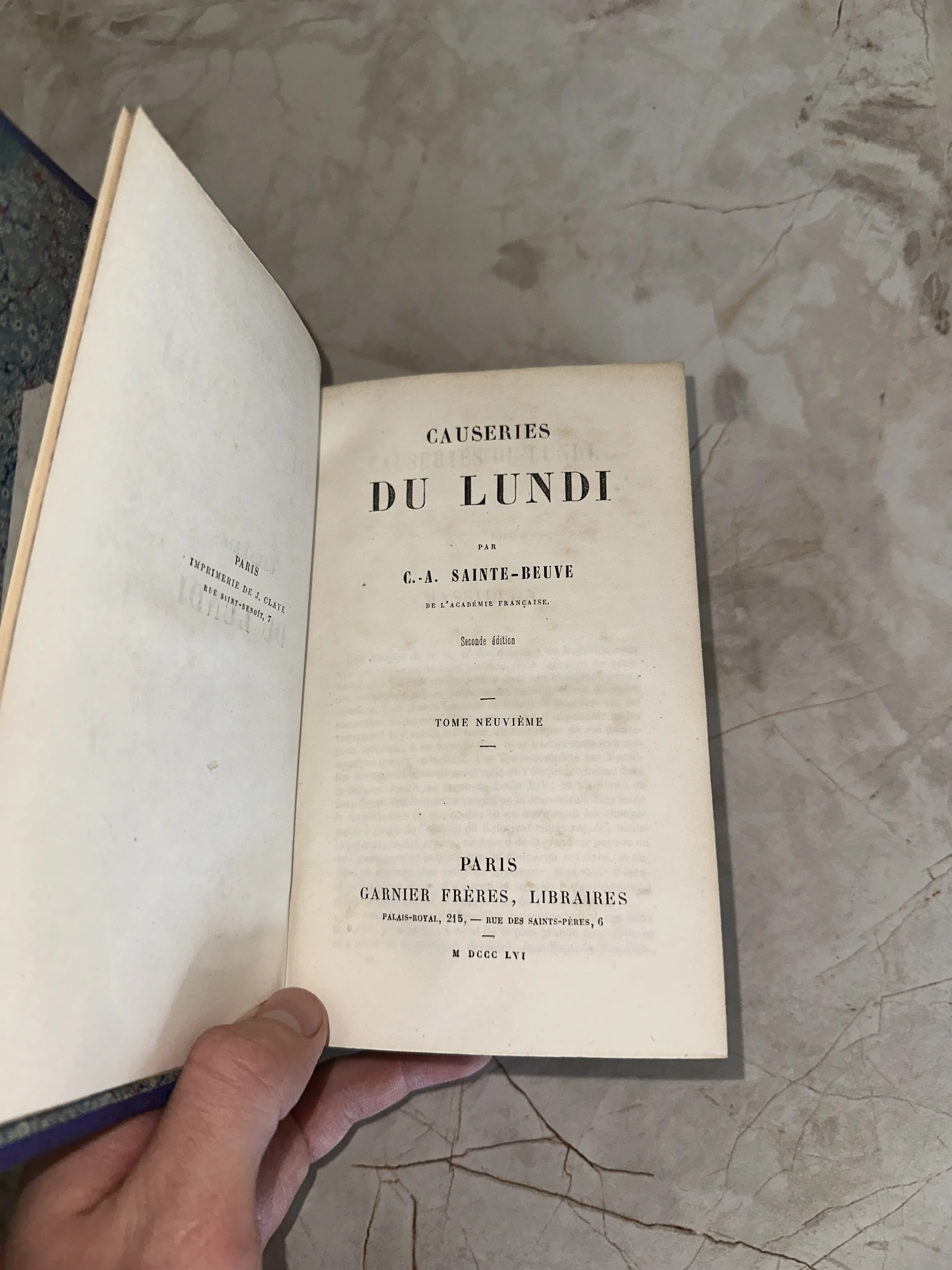 Титульный лист старинной книги на французском языке 'Causeries du Lundi' автора C.-A. Sainte-Beuve, издание Garnier Frères, Париж, 1856 год.