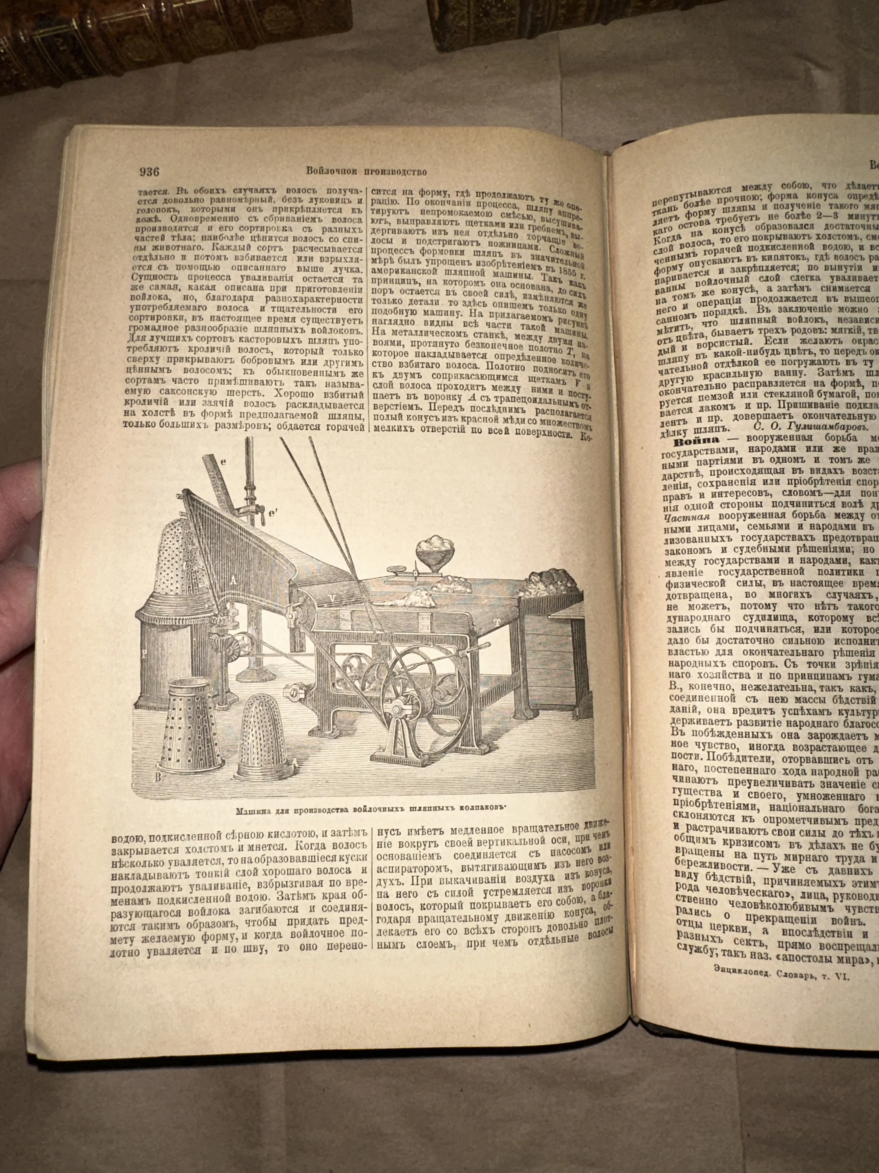Разворот старинной книги с дореволюционным текстом на русском языке и детальной гравюрой промышленного станка для изготовления шляпного войлока.