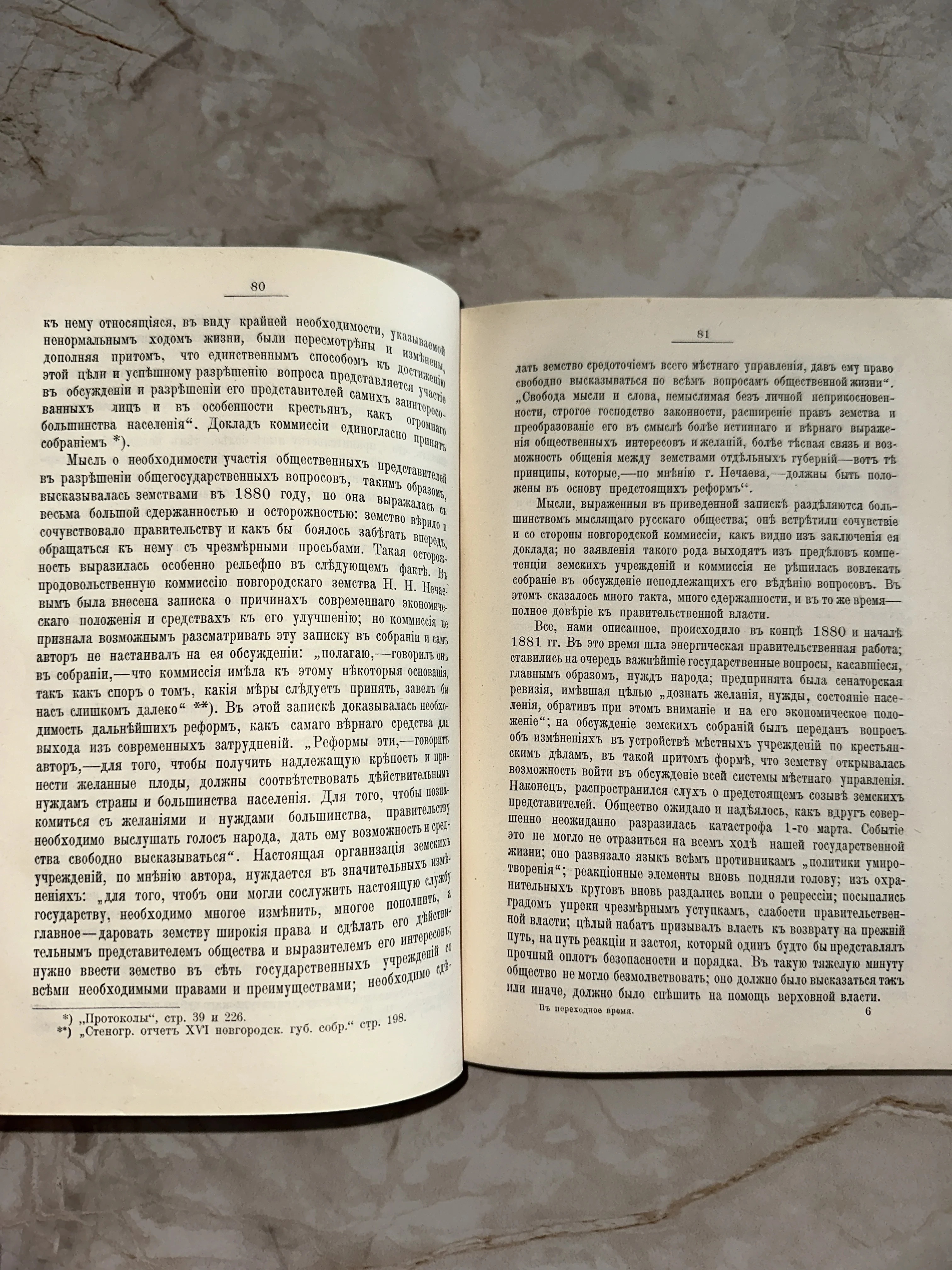 Перед вами подлинный фрагмент истории — разворот редкого издания конца XIX века, посвященного социально-политическому устройству России. Плотная пожелтевшая бумага и классический шрифт с ятями создают неповторимую атмосферу интеллектуального поиска той эпохи. Прекрасная сохранность страниц делает этот экземпляр ценным приобретением для коллекционера исторической литературы и исследователей прошлого.