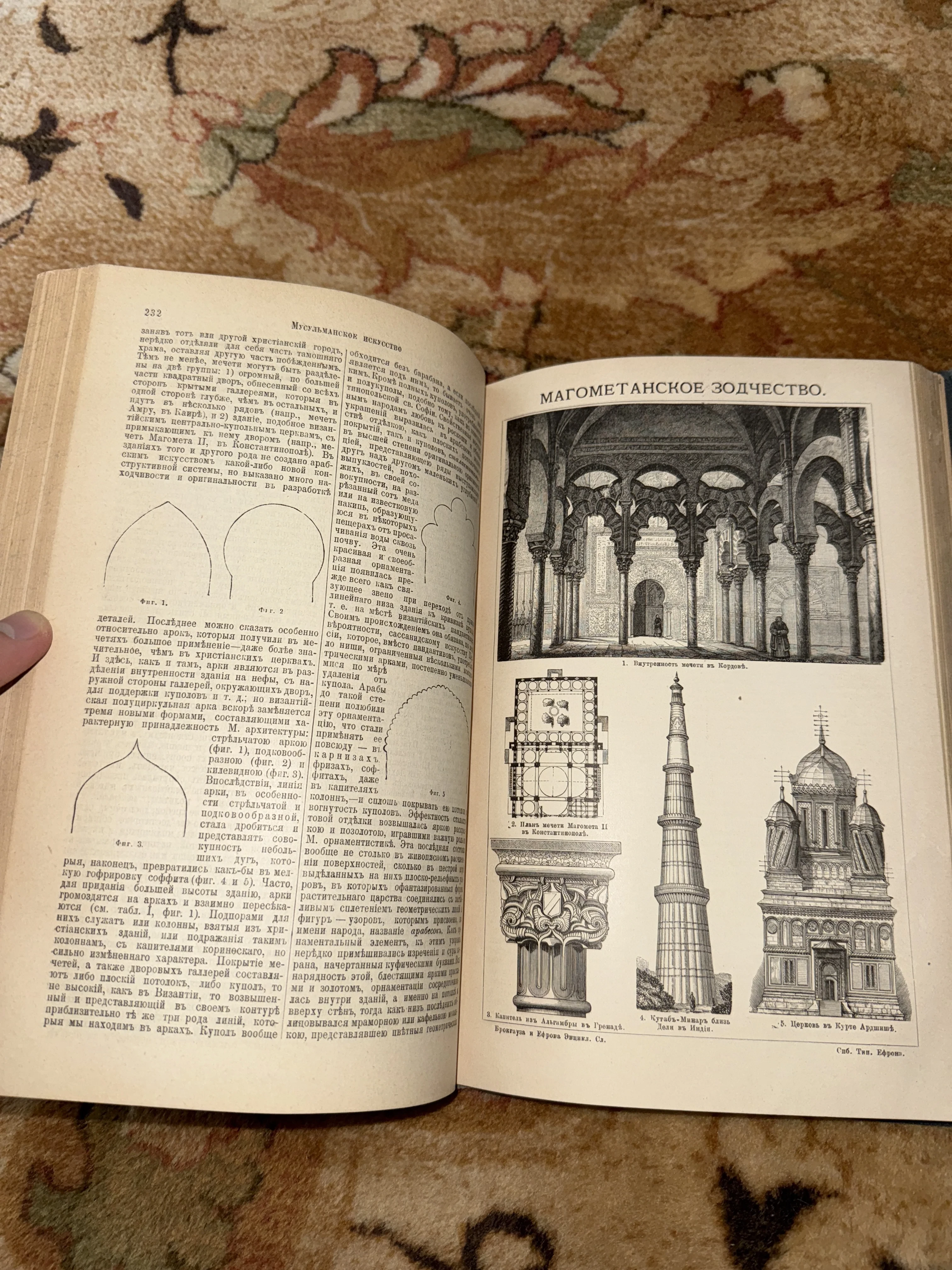 Уникальный разворот из дореволюционного издания, посвященный истории исламского зодчества. Страница содержит детализированные гравюры, передающие величие восточной архитектуры, от интерьеров мечетей до изящных капителей. Бумага сохранила приятный кремовый оттенок и четкость типографской печати, что делает этот лист ценным приобретением для коллекционера.