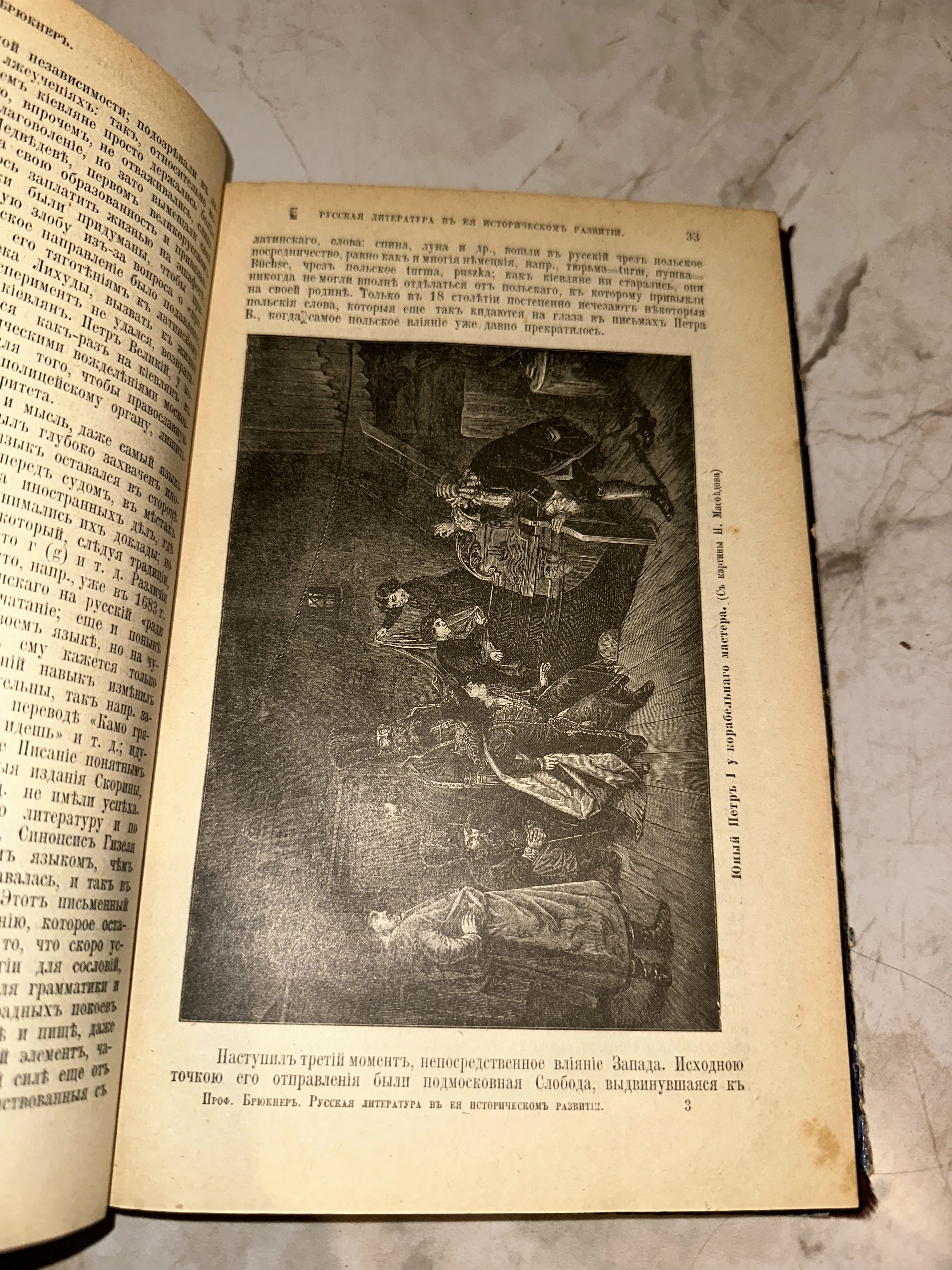 Уникальный разворот из исторического труда профессора Брюкнера с детальной иллюстрацией по картине Мясоедова. Издание сохранило очарование ушедшей эпохи: характерная дореволюционная орфография и мягкое пожелтение бумаги подчеркивают его подлинность. Гравюра, запечатлевшая юного Петра I, станет ценным дополнением для коллекции редких книг или исторических материалов.