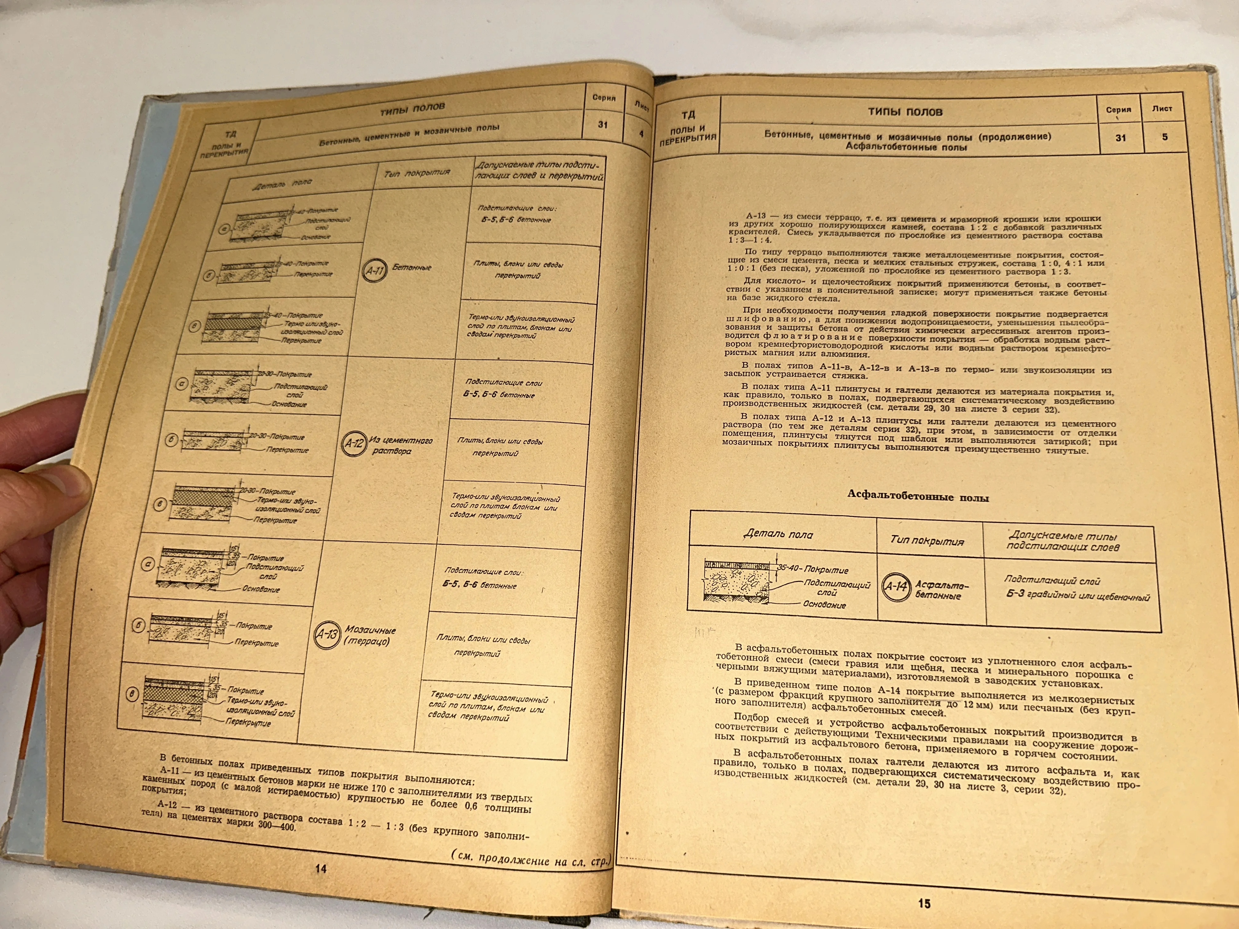 Уникальное техническое издание советской эпохи, представляющее подробные схемы и спецификации промышленных полов. Желтоватые страницы с четкой типографикой и детальными чертежами передают атмосферу эпохи масштабного индустриального строительства. Настоящая находка для историков архитектуры и ценителей винтажной инженерной графики.