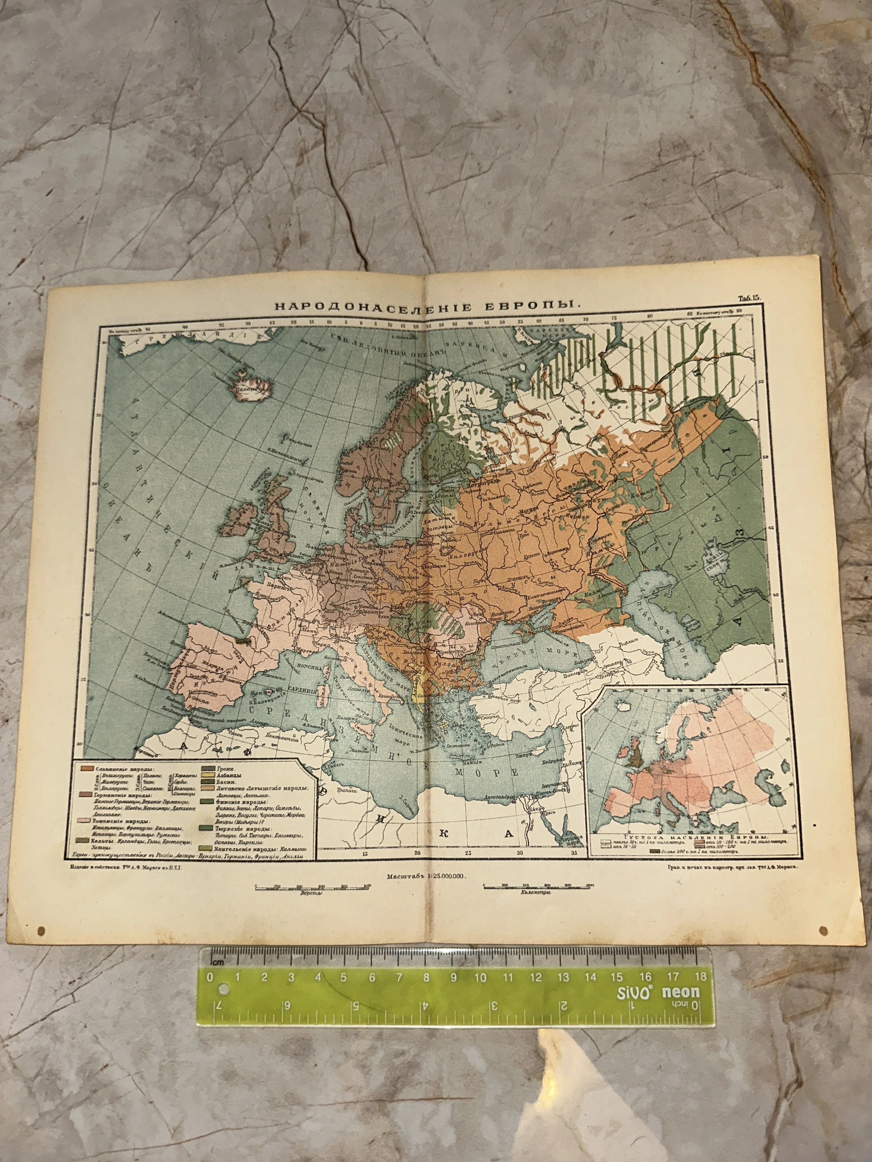 Уникальная этнографическая карта начала XX века, представляющая детальную картину расселения народов Европы. Издание отличается великолепной цветопередачей и подробной легендой, отражающей исторические границы и этнический состав того времени. Этот подлинный бумажный артефакт в прекрасном состоянии станет ценным приобретением для коллекционера или изысканным украшением рабочего кабинета.