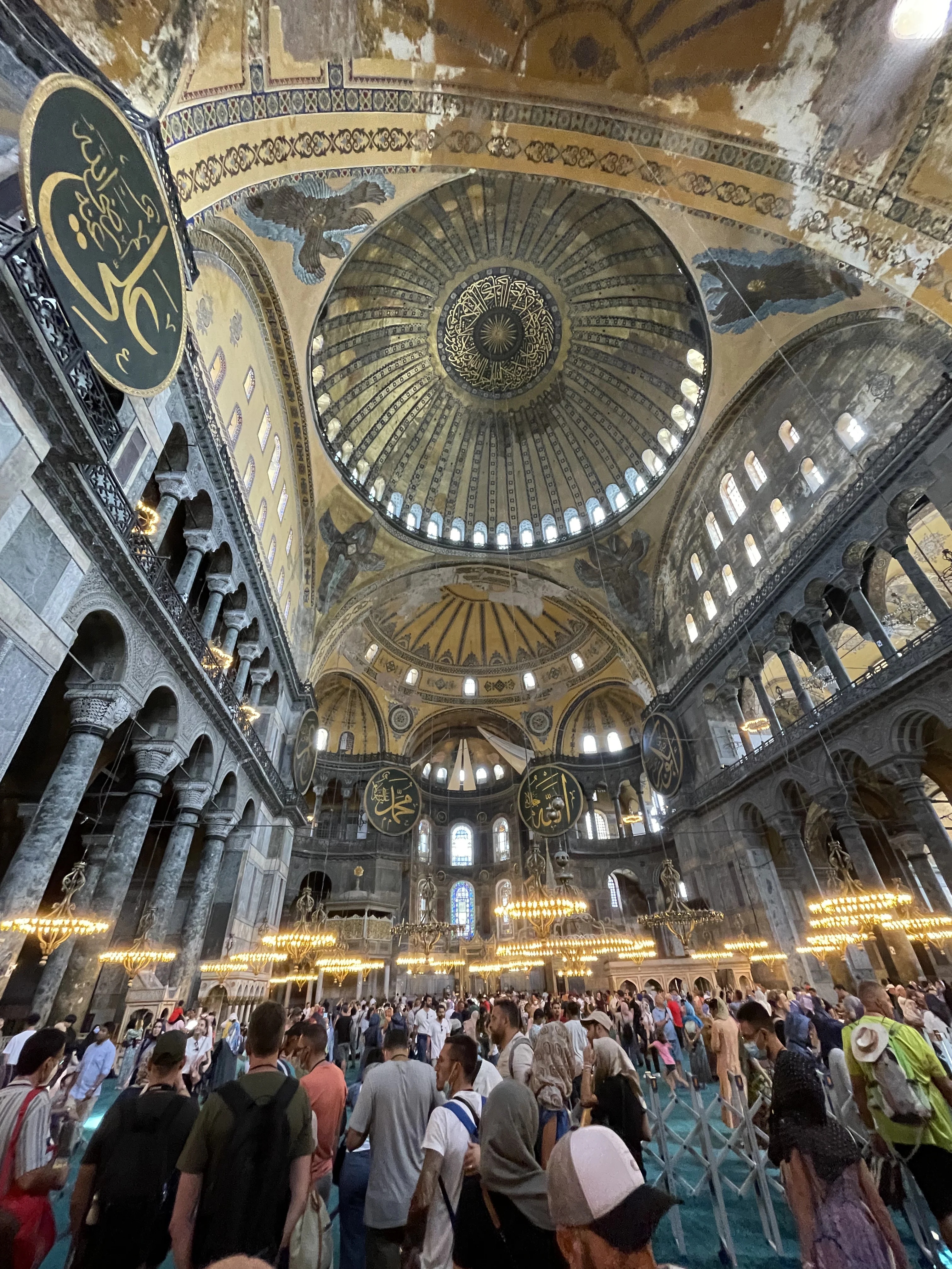 Интерьер собора Святой Софии в Стамбуле с видом на главный купол, исламские медальоны и старинные люстры.