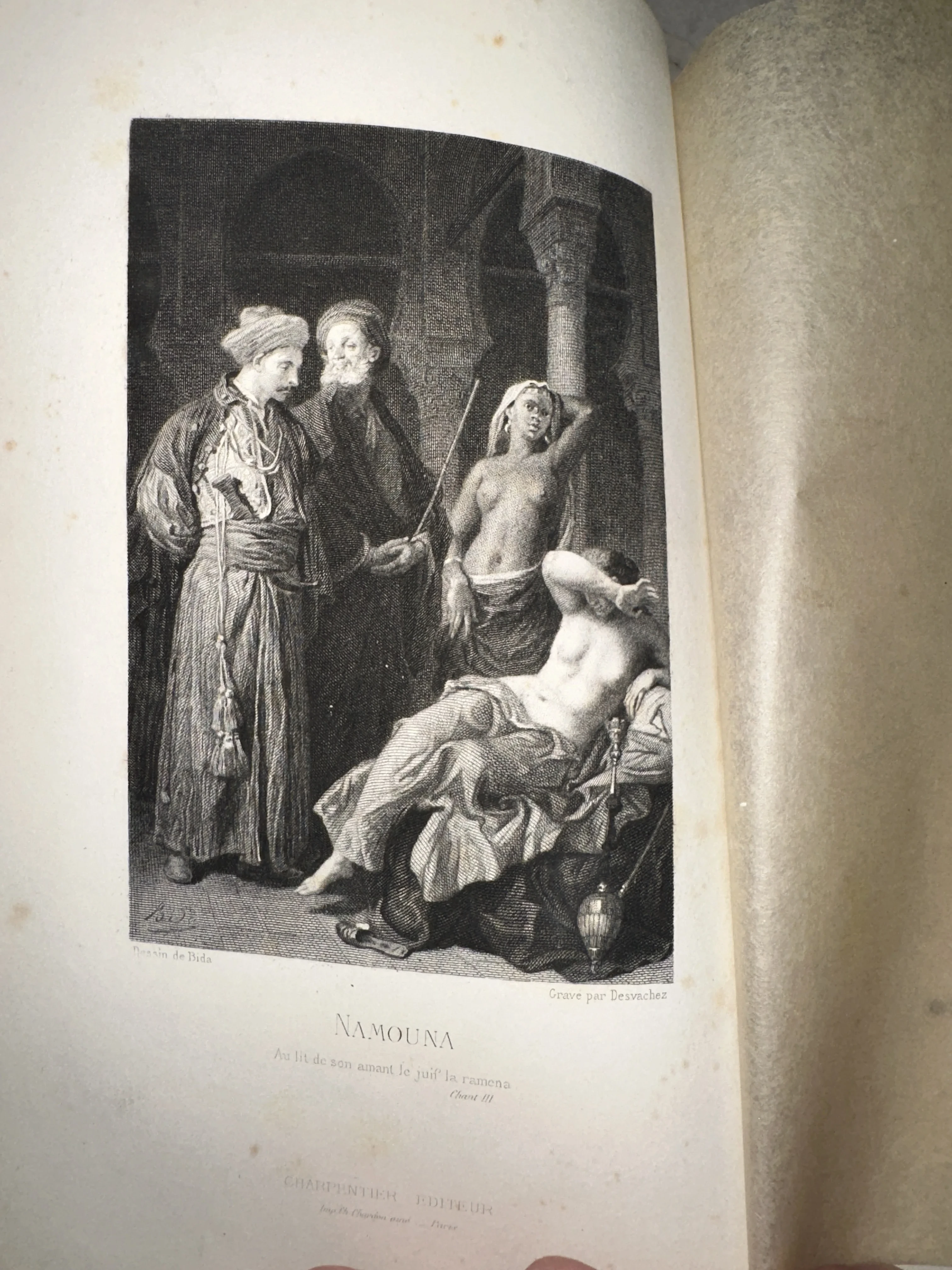 Великолепный образец французской книжной графики XIX века, иллюстрирующий знаменитую поэму Альфреда де Мюссе. Тончайшая работа гравера Давида Деваше по эскизу Александра Бида мастерски передает экзотическую атмосферу Востока и драматическую игру светотени. Состояние бумаги с легким благородным пожелтением придает листу особый шарм и подтверждает его подлинный антикварный статус.