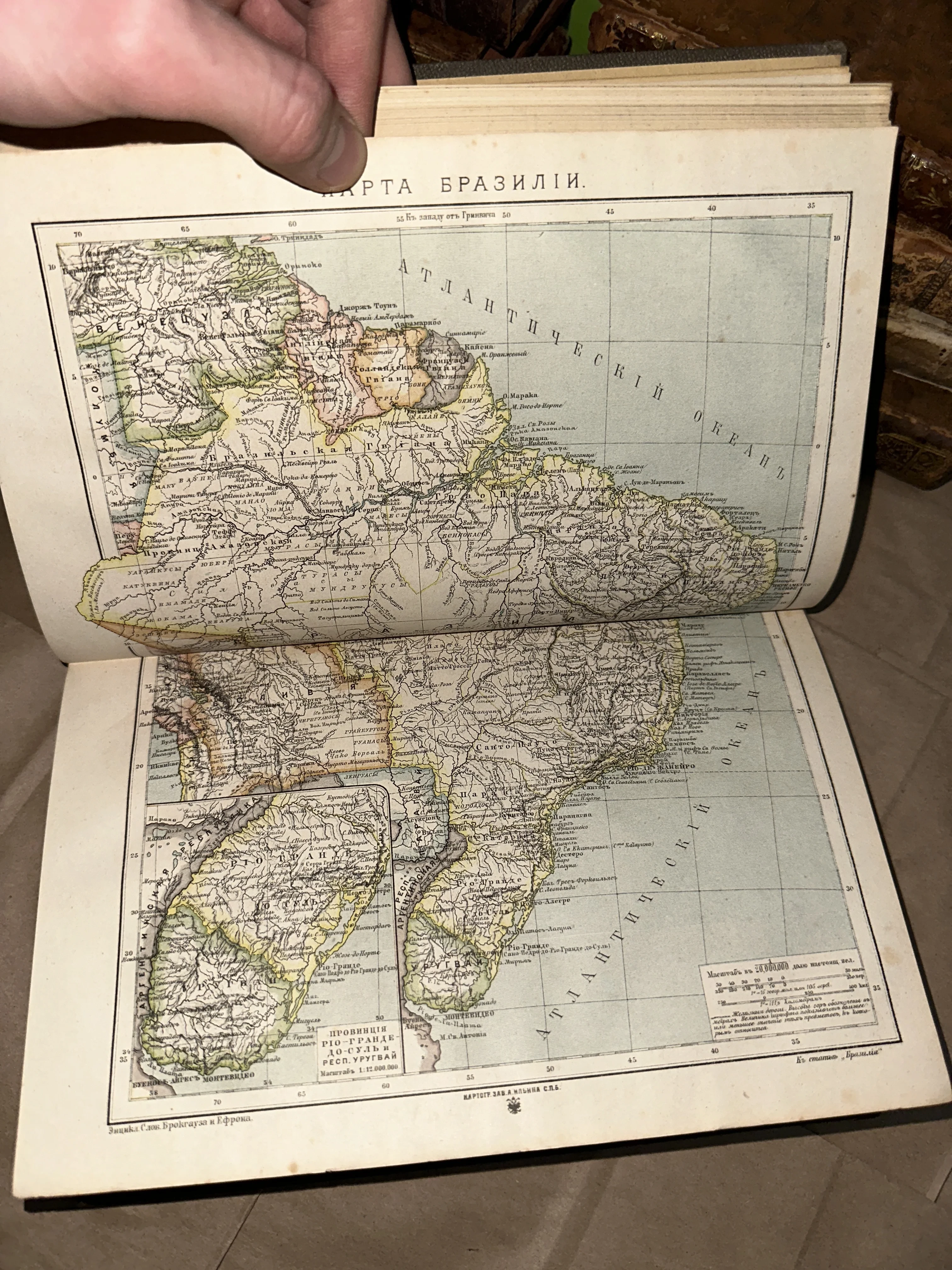 Разворот старинной книги с цветной литографированной картой Бразилии и Атлантического океана на русском языке.