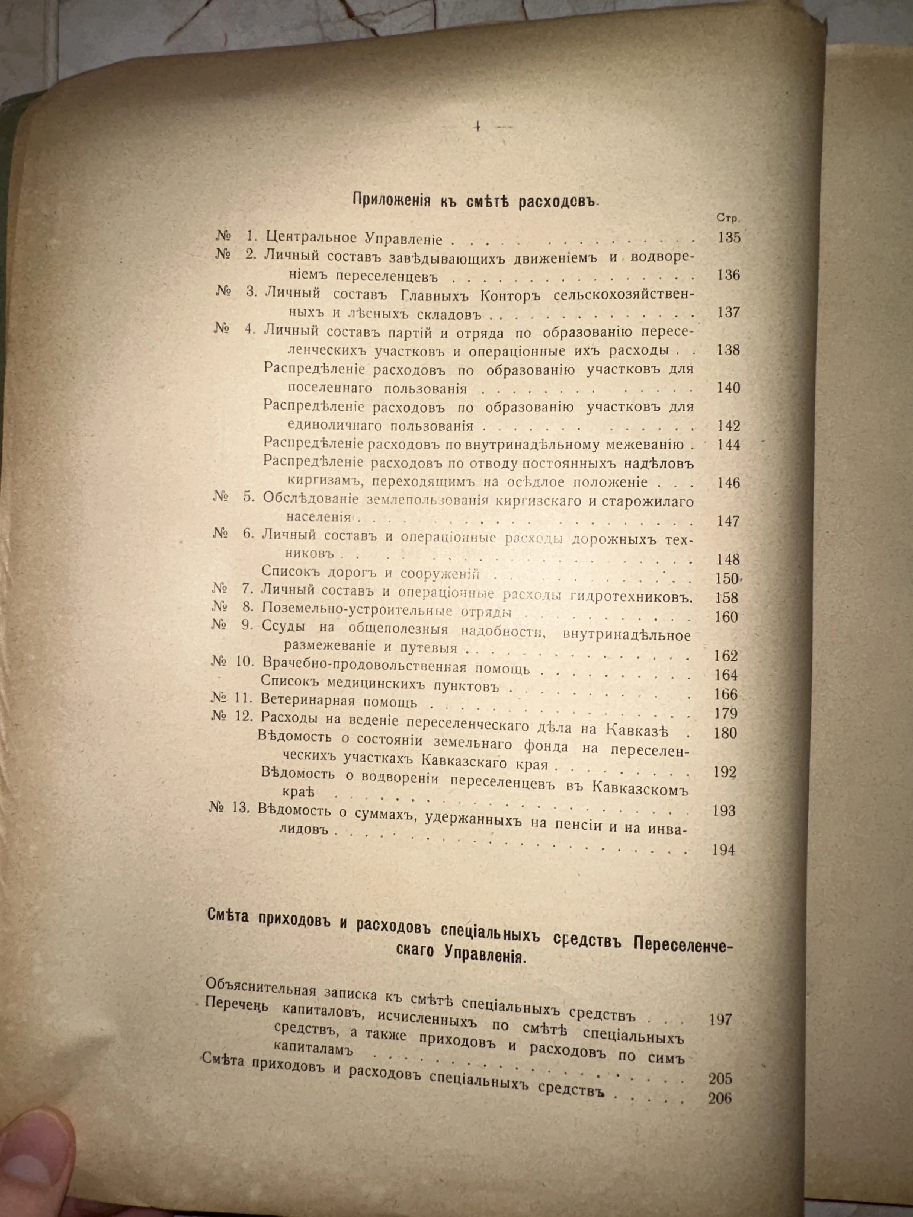 Перед вами подлинный документ эпохи — страница с оглавлением приложений к бюджетному отчету Переселенческого управления Российской империи. Текст, набранный характерным антикварным шрифтом с использованием дореволюционной грамматики, детально описывает расходы на освоение земель Кавказа и Средней Азии. Благородная патина времени на бумаге подчеркивает историческую ценность этого редкого ведомственного издания.