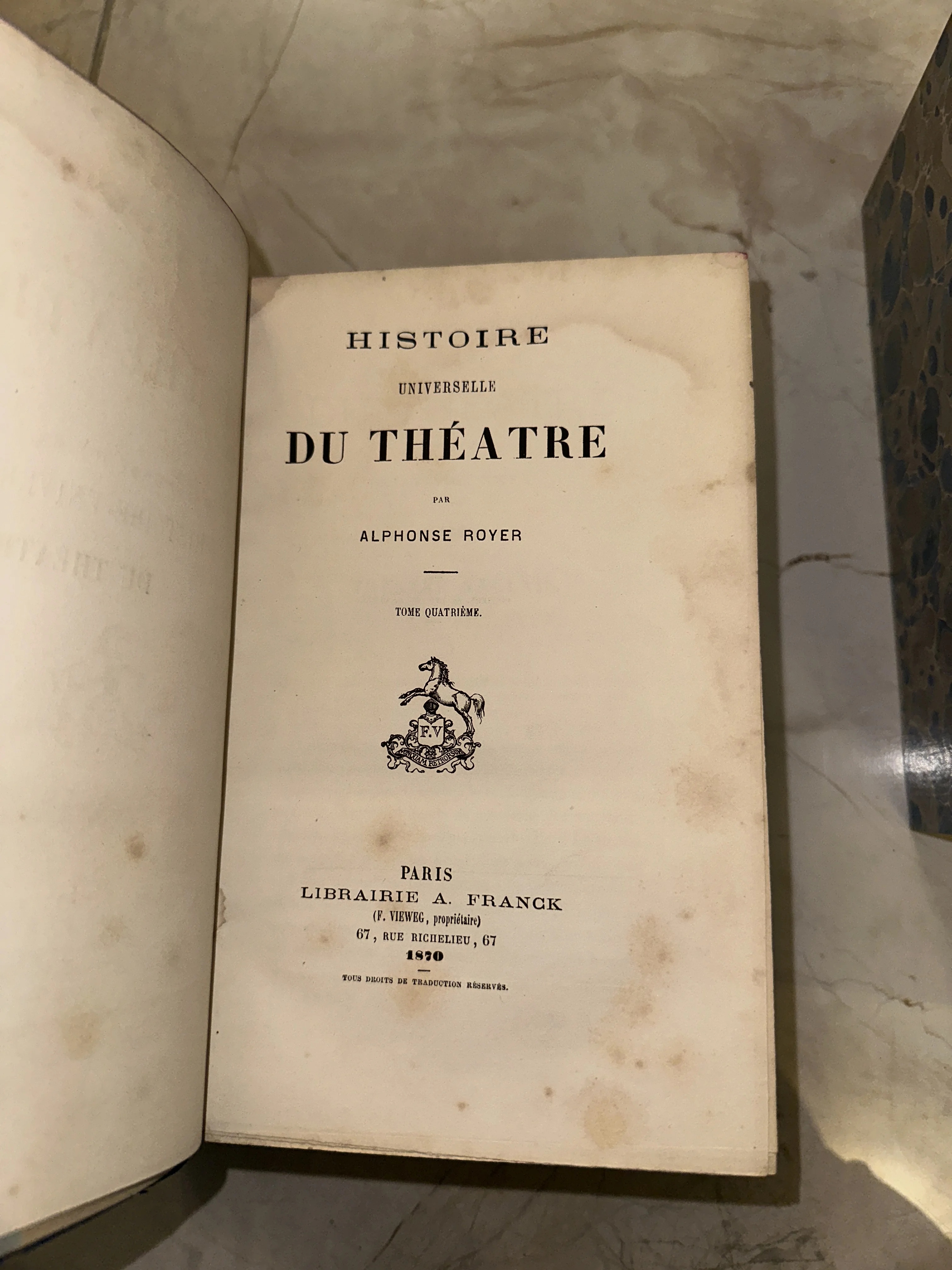 Перед вами титульный лист четвертого тома фундаментального труда по истории мирового театра, изданного в Париже книжным домом A. Franck. Страницы сохранили естественное пожелтение и благородный лисий крап, подчеркивающие почтенный возраст и аутентичность издания XIX века. Книга представляет коллекционную ценность для историков искусства и ценителей изящной французской типографики.