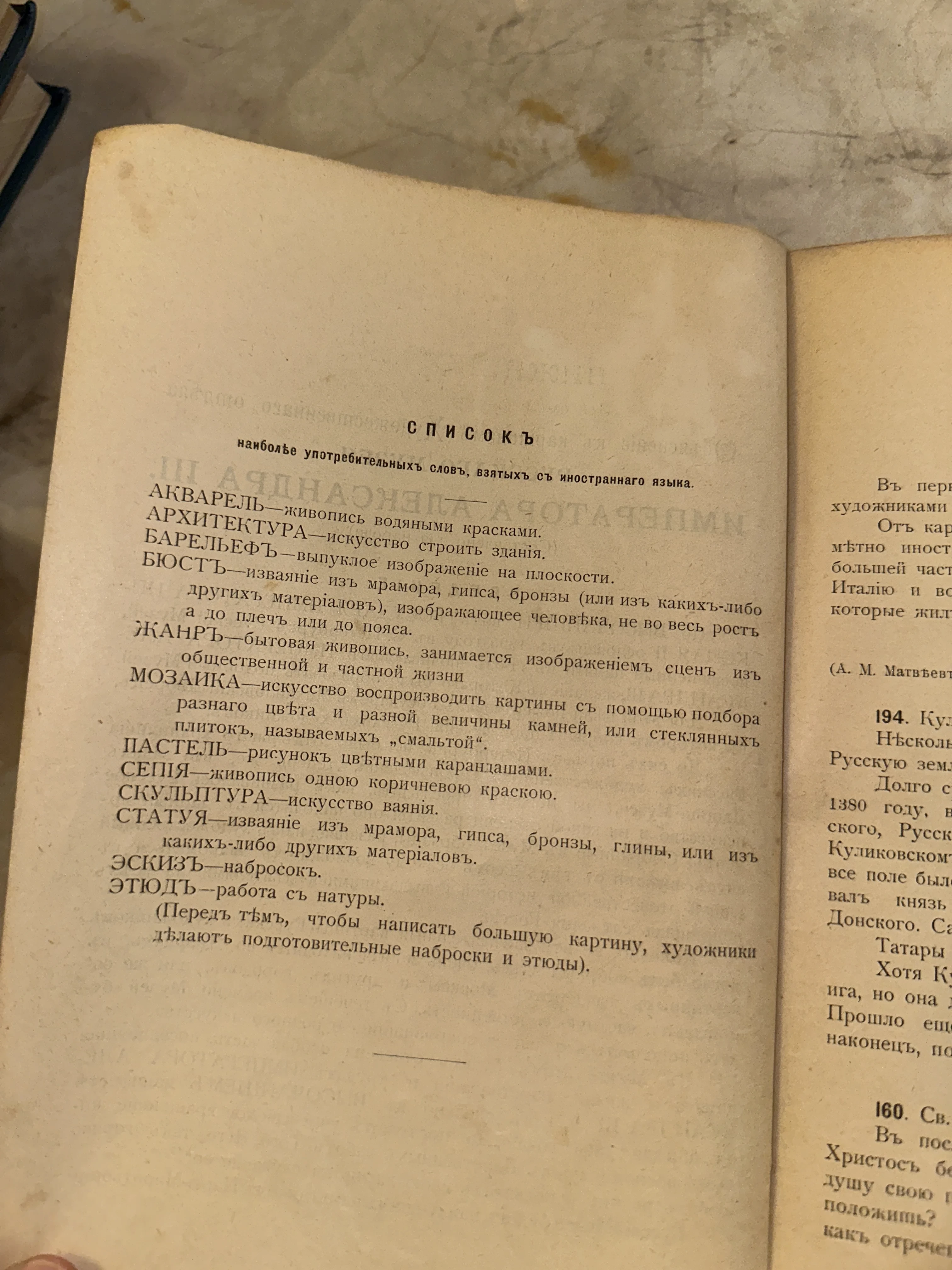Аутентичная страница из антикварного издания с глоссарием наиболее употребительных слов иностранного происхождения. Пожелтевшая бумага с характерными следами времени и дореволюционная орфография передают неповторимый дух эпохи просвещения начала XX века. Идеальный образец старинной типографики для ценителей истории искусства и редкой литературы.