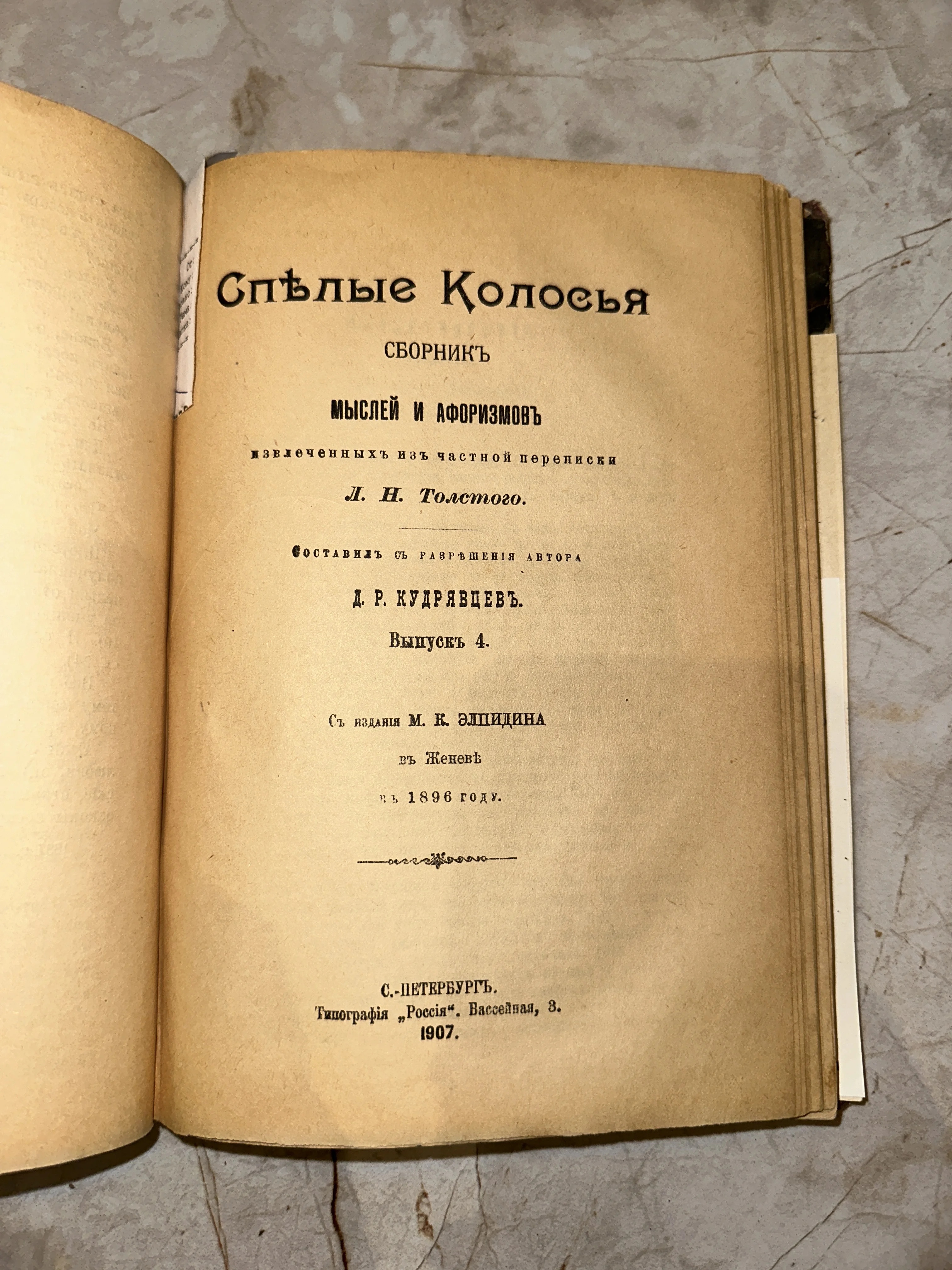Титульный лист антикварной книги «Спелые колосья» со сборником мыслей и афоризмов Льва Толстого, изданной в Санкт-Петербурге в 1907 году.