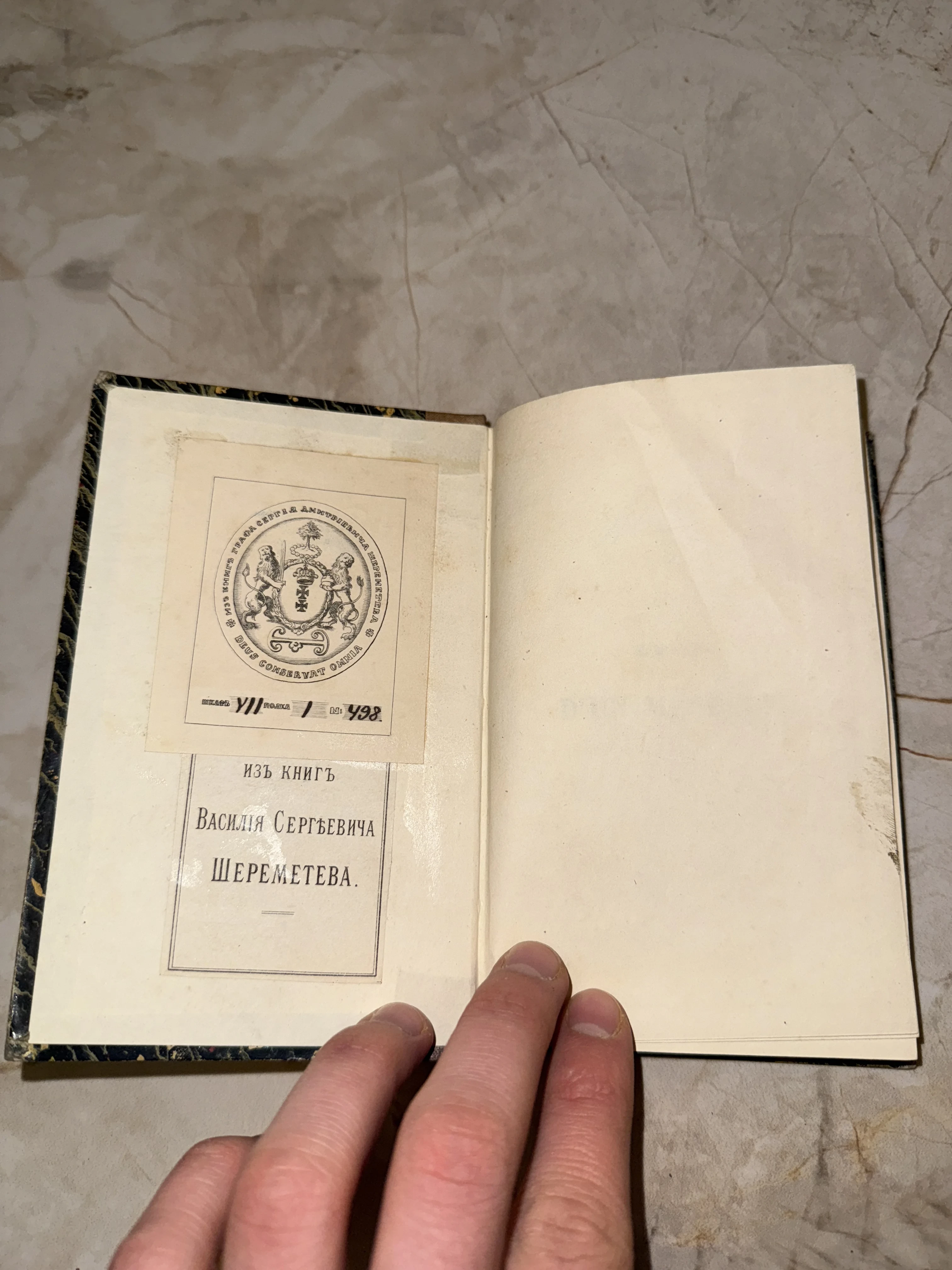 Уникальный экземпляр из личного собрания графа С. Д. Шереметева, о чем свидетельствует роскошный гербовый экслибрис с девизом «Deus conservat omnia». Сохранность форзаца с элементами мраморной бумаги и четкие рукописные пометки о расположении в библиотеке подчеркивают подлинную историческую ценность этого библиографического артефакта.