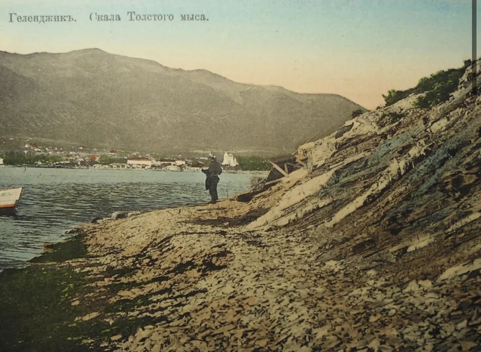 Редкий фотографический вид дореволюционного Геленджика, запечатлевший первозданную красоту Толстого мыса и величие Кавказских гор. На снимке детально передана текстура слоистых скал и спокойствие черноморской бухты, дополненное мягкой колористикой начала XX века. Превосходный экземпляр для коллекционеров южных видов и истории российского курорта.