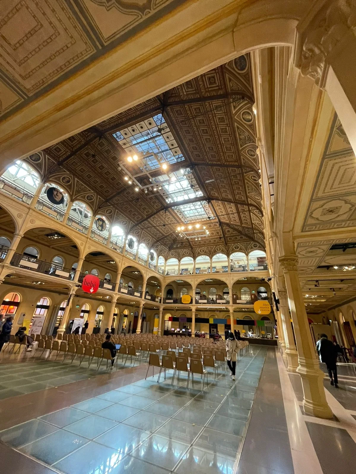 Величественный интерьер поражает своей монументальностью: роскошный кессонный потолок с изысканной росписью гармонично сочетается с легкими многоярусными аркадами. Особое очарование пространству придает игра света, проникающего сквозь потолочные окна и подчеркивающего строгую геометрию колонн. Это выдающийся образец архитектурного искусства, сохранивший атмосферу торжественности и исторической значимости.