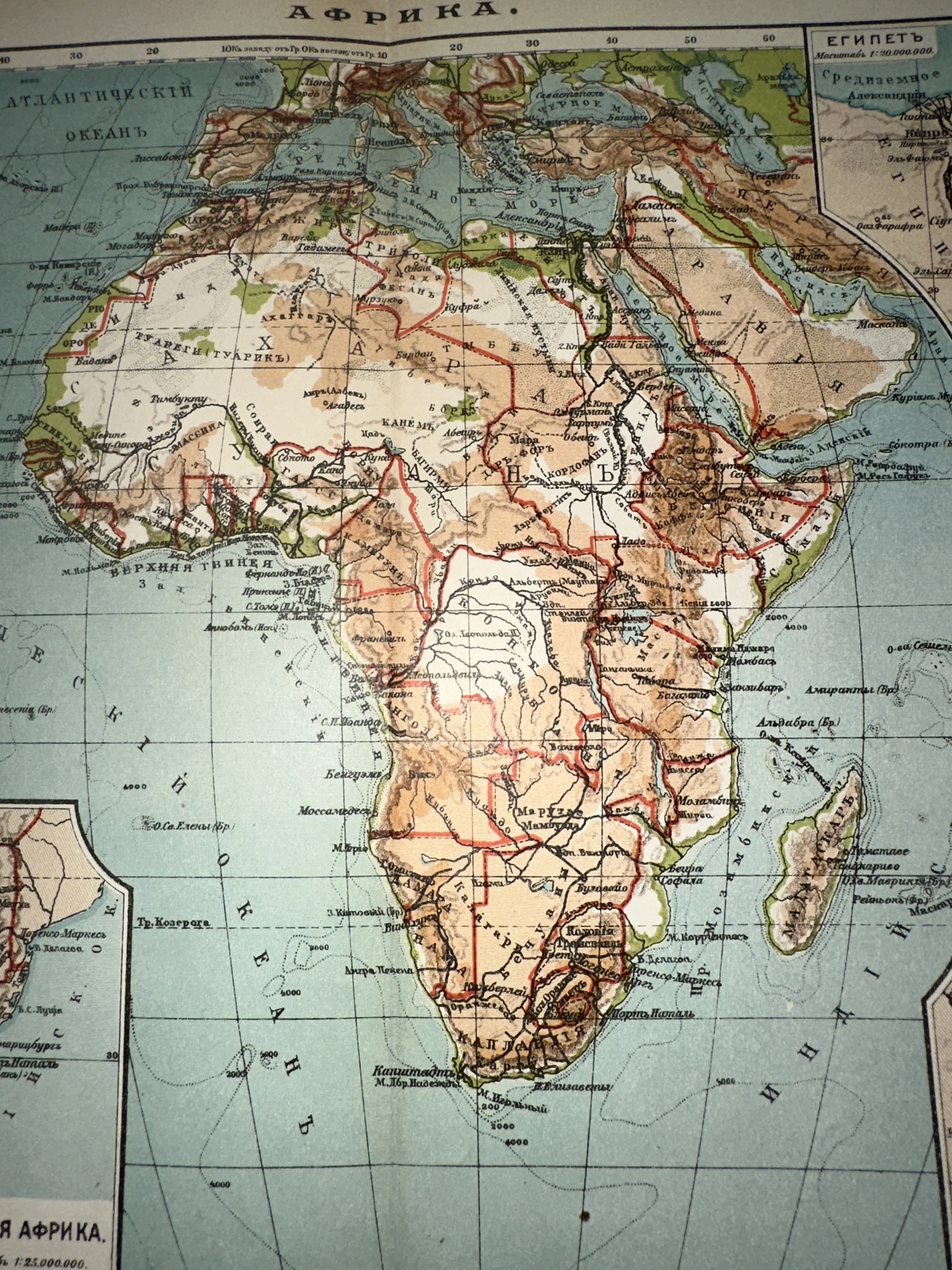 Старинная физико-политическая карта Африки с русскими названиями в дореволюционной орфографии.