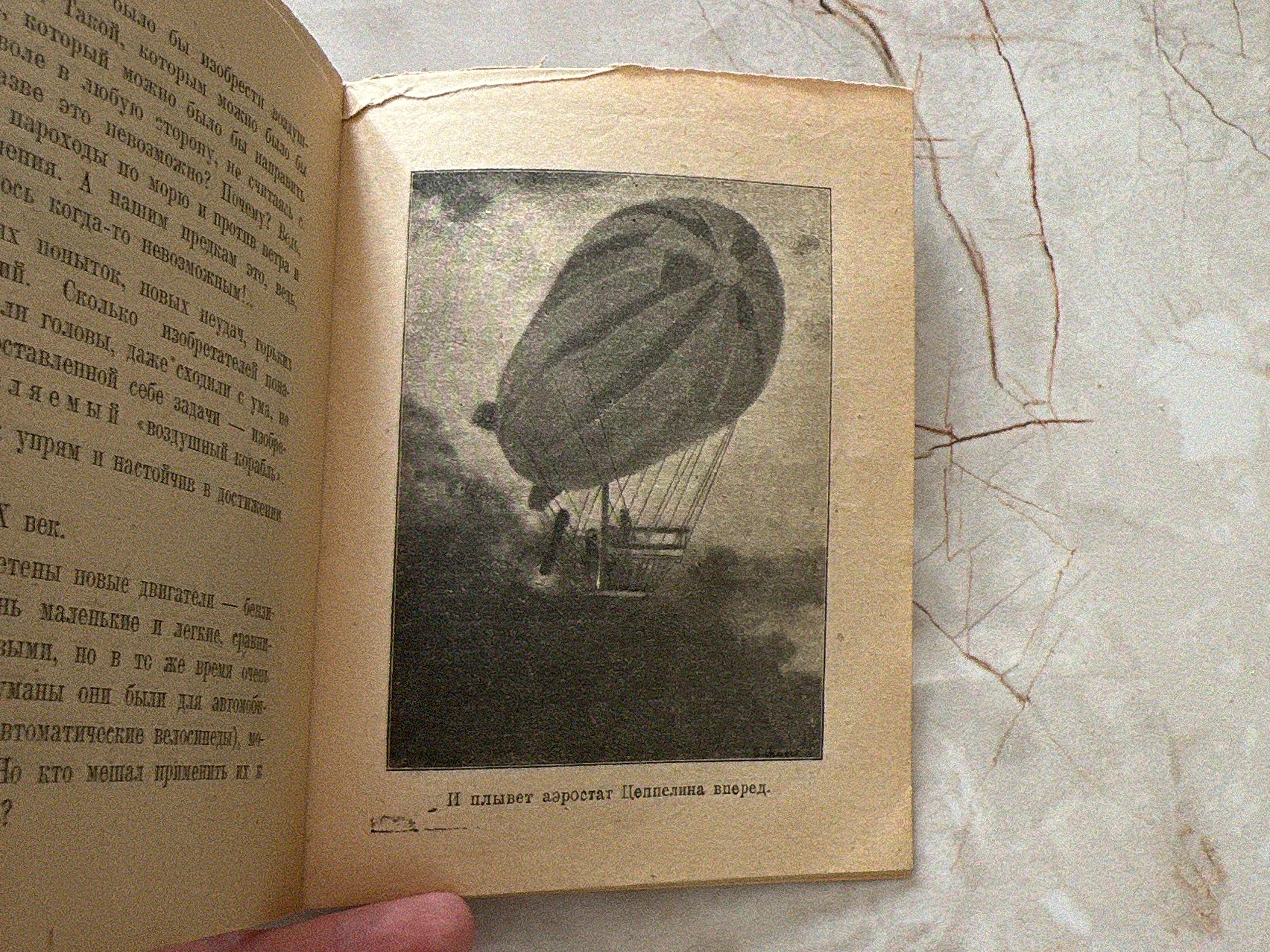 Редкий книжный разворот, запечатлевший эпоху зари воздухоплавания с детальным изображением легендарного аэростата Цеппелина. Пожелтевшие от времени страницы и аутентичный шрифт начала XX века передают дух великих открытий и технических достижений прошлого. Сохранность бумаги и характерная патина подчеркивают антикварную ценность этого свидетельства истории авиации.