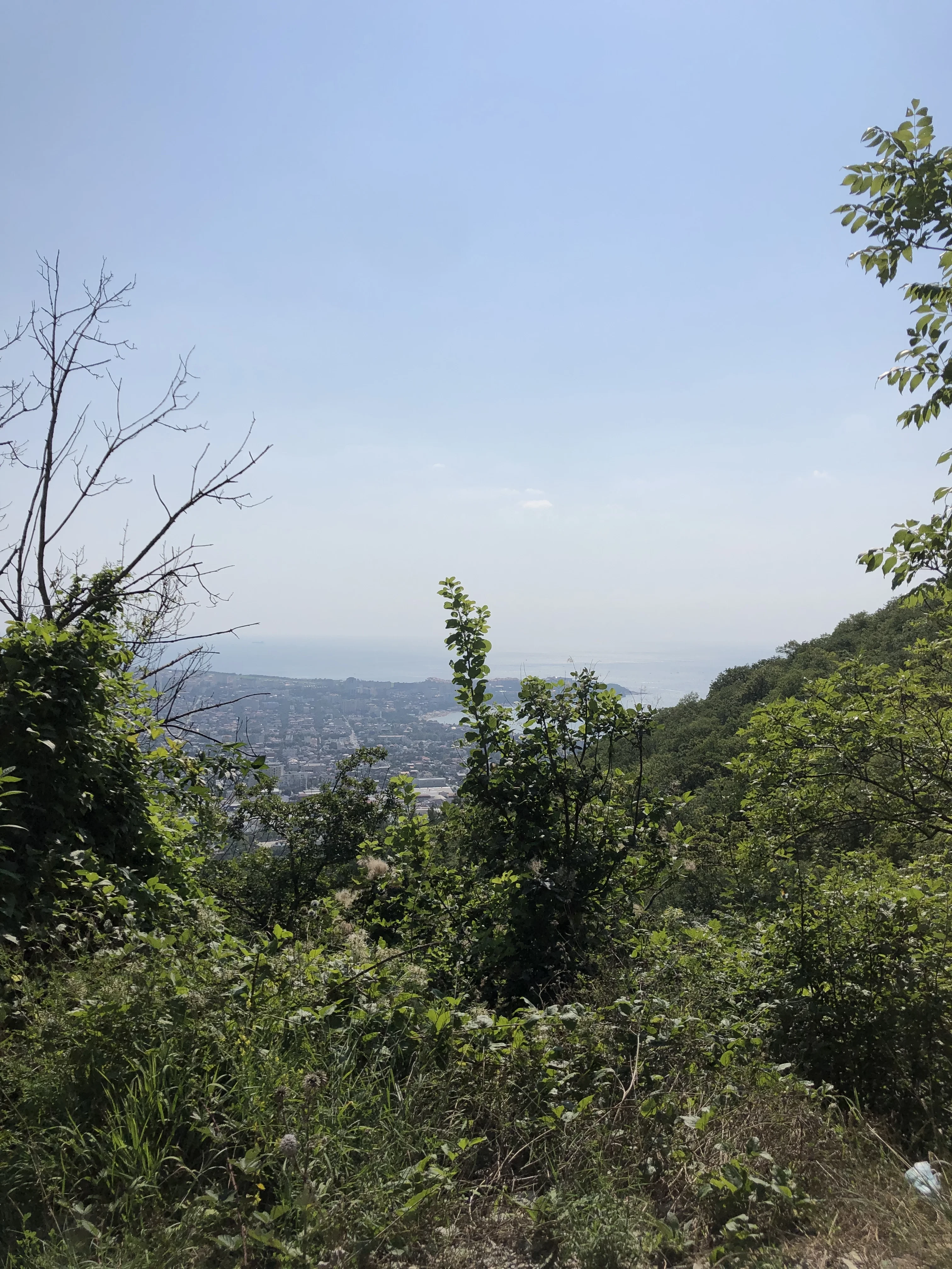 Панорама приморского города сквозь зелень гор