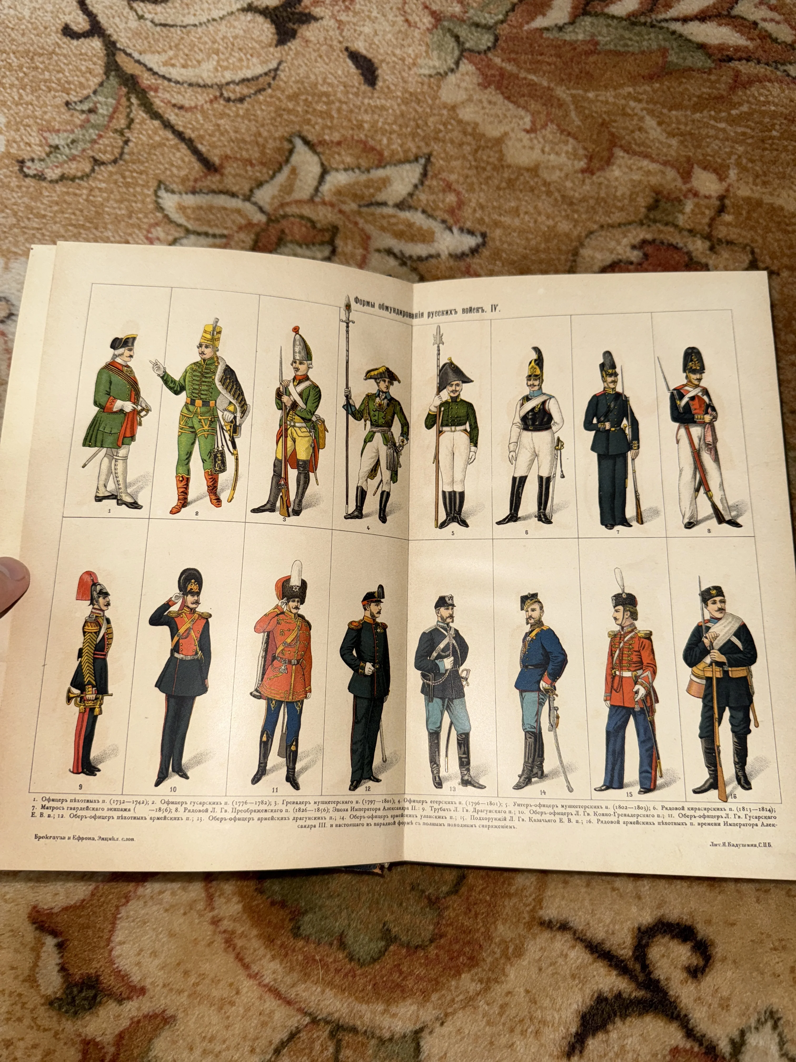 Разворот антикварной книги с цветной литографией, изображающей 16 фигур российских военных в исторических мундирах XVIII-XIX веков.