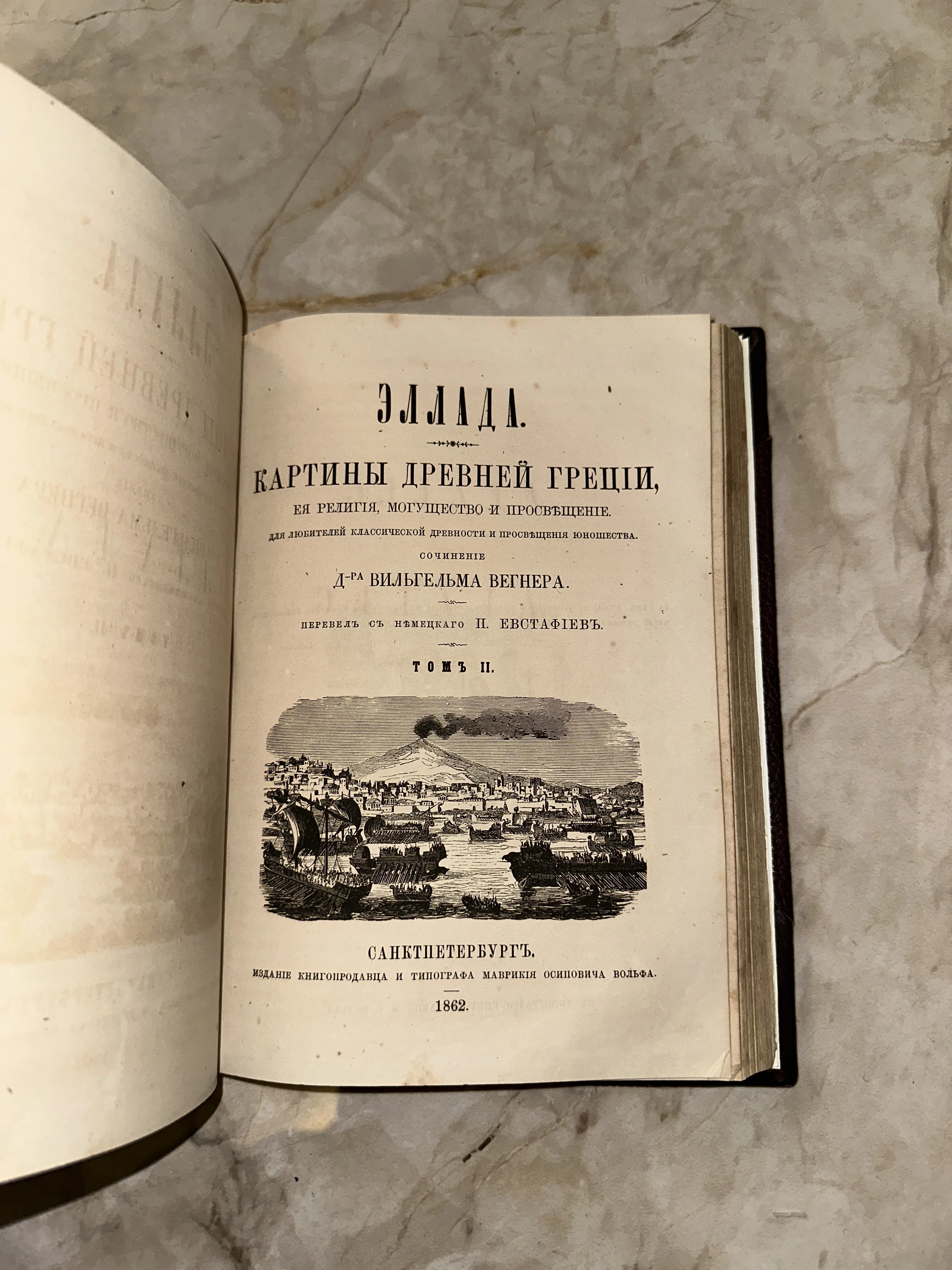 Редкое антикварное издание из типографии Маврикия Вольфа, посвященное величию античной цивилизации. Титульный лист украшен детальной ксилографией с изображением флота у стен города, а благородная патина на бумаге подчеркивает возраст и ценность этого просветительского труда.