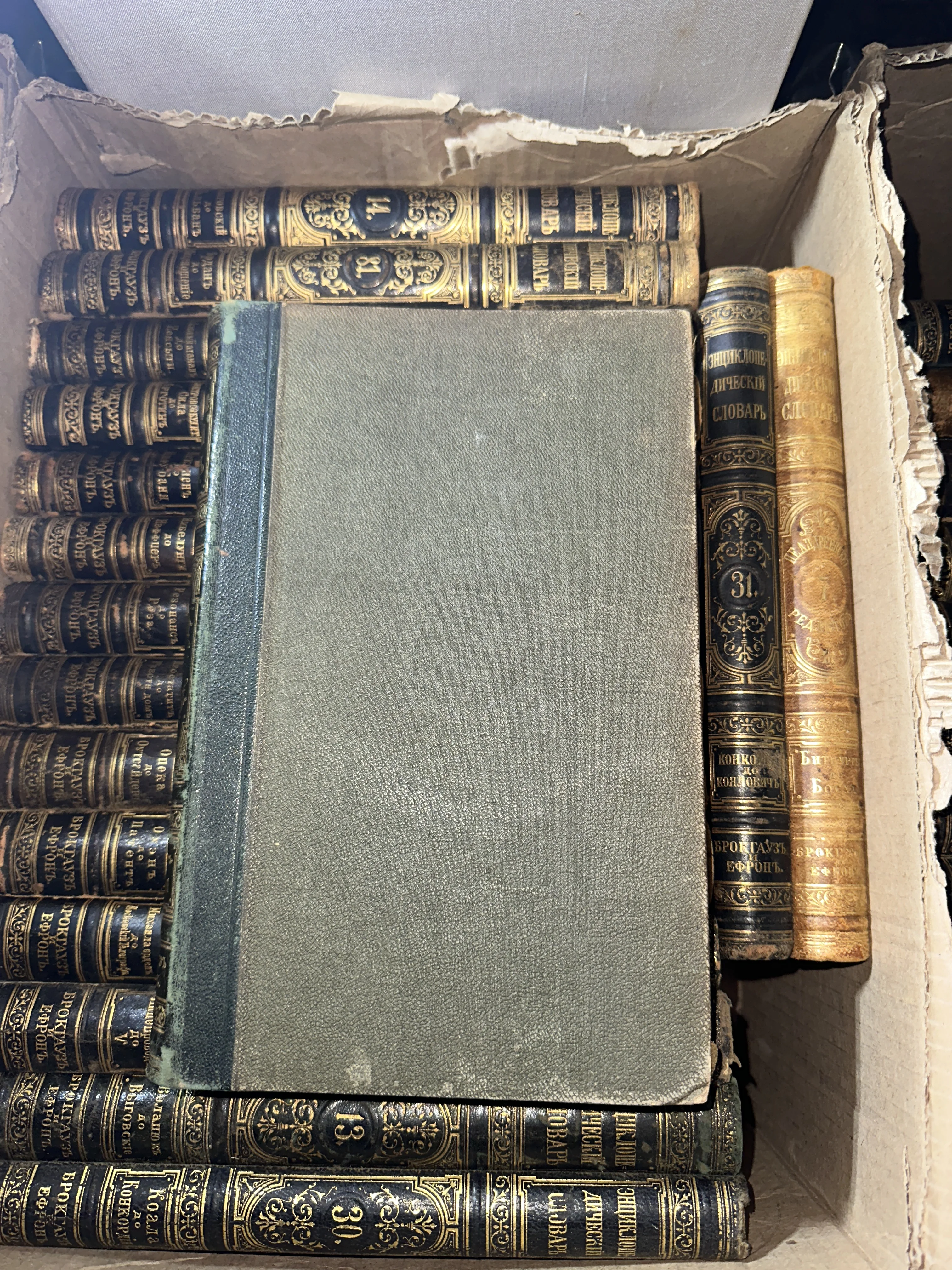 Старинные тома энциклопедического словаря Брокгауза и Ефрона с золотым тиснением в картонной коробке.