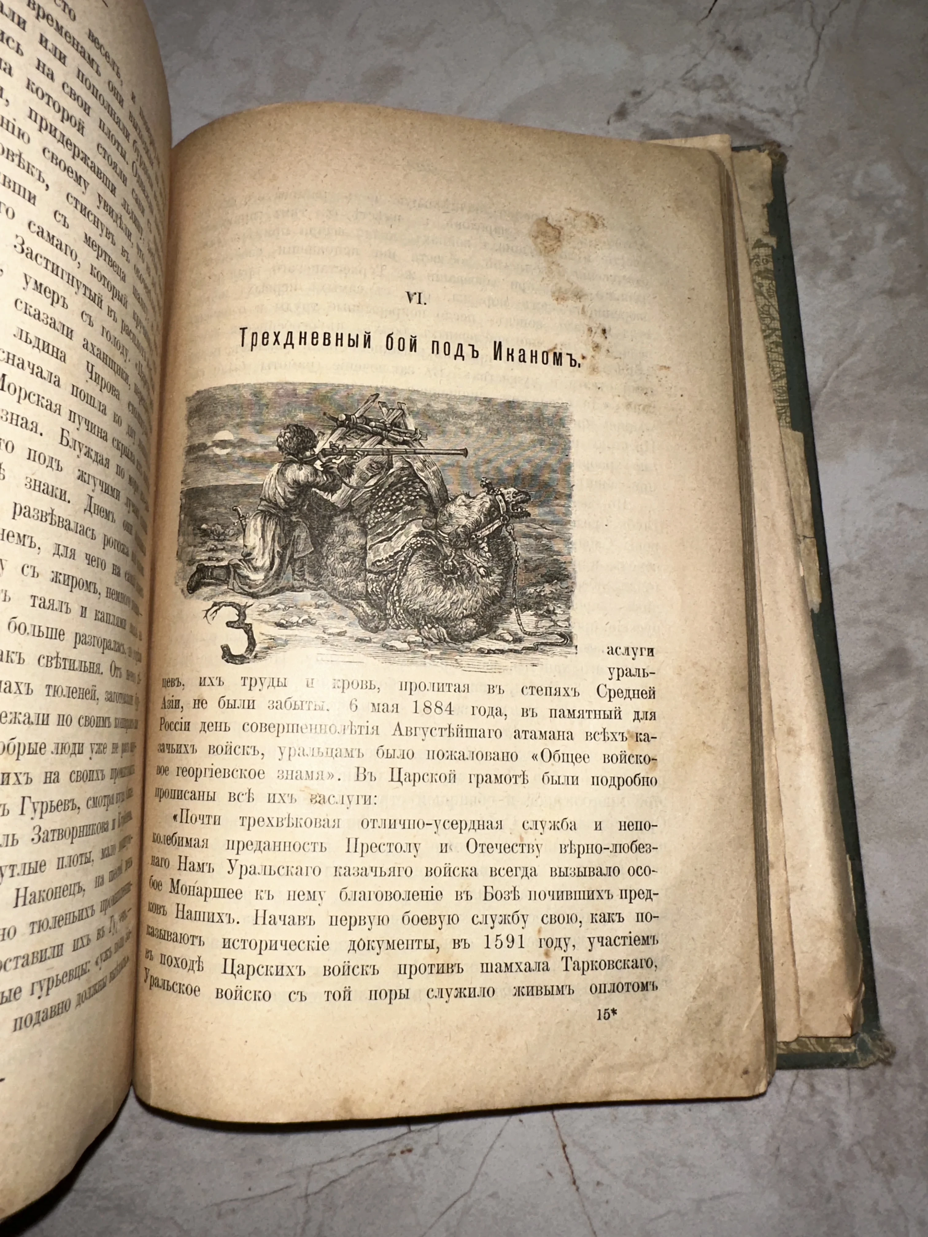 Уникальный разворот антикварного издания, повествующий о героическом эпизоде Туркестанских походов — сражении под Иканом. Страница украшена выразительной гравюрой с изображением казака, использующего верблюда в качестве укрытия, а благородная патина и следы времени на бумаге подчеркивают подлинную историческую ценность предмета. Идеальный экземпляр для коллекции, посвященной военной истории Российской империи и казачества.