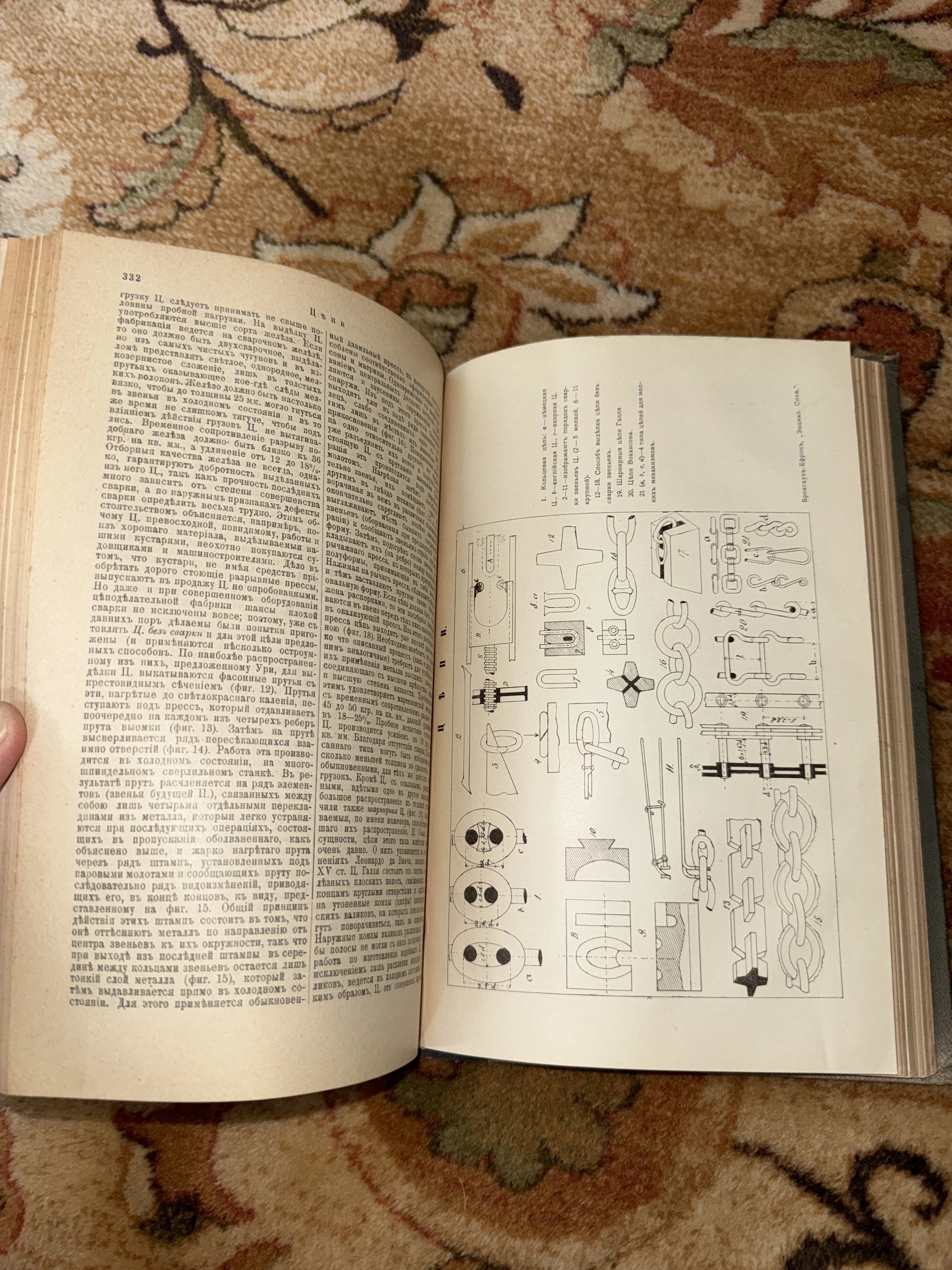 Уникальный образец технической литературы начала XX века, сохранивший четкость типографской печати и детальные инженерные схемы. На страницах представлено подробное описание кузнечных технологий и видов цепей, дополненное наглядными иллюстрациями механизмов. Книга обладает характерным благородным патинированием бумаги, подчеркивающим её почтенный возраст и историческую ценность.