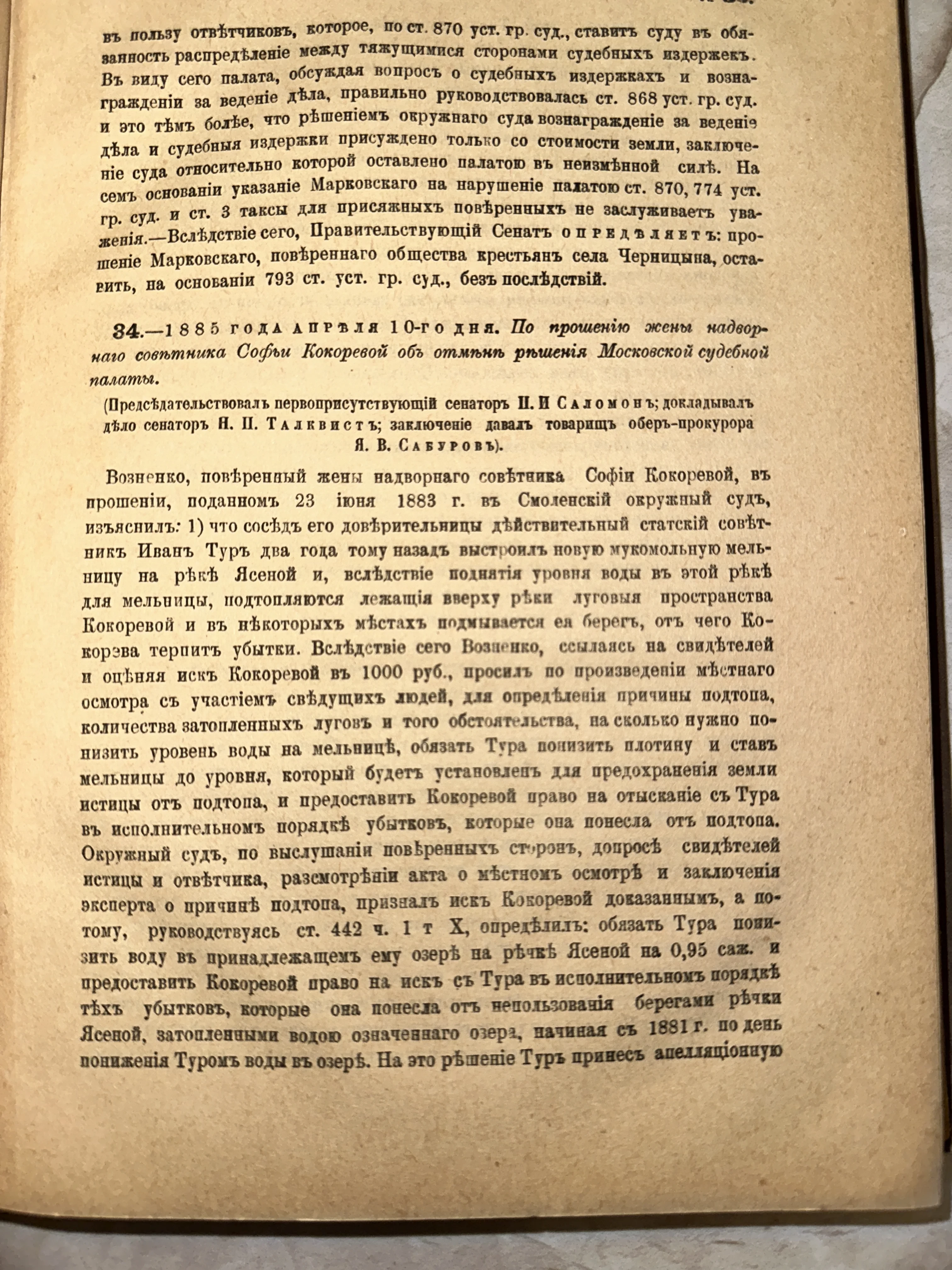 Старинная книжная страница с текстом на дореволюционном русском языке о судебном деле 1885 года.