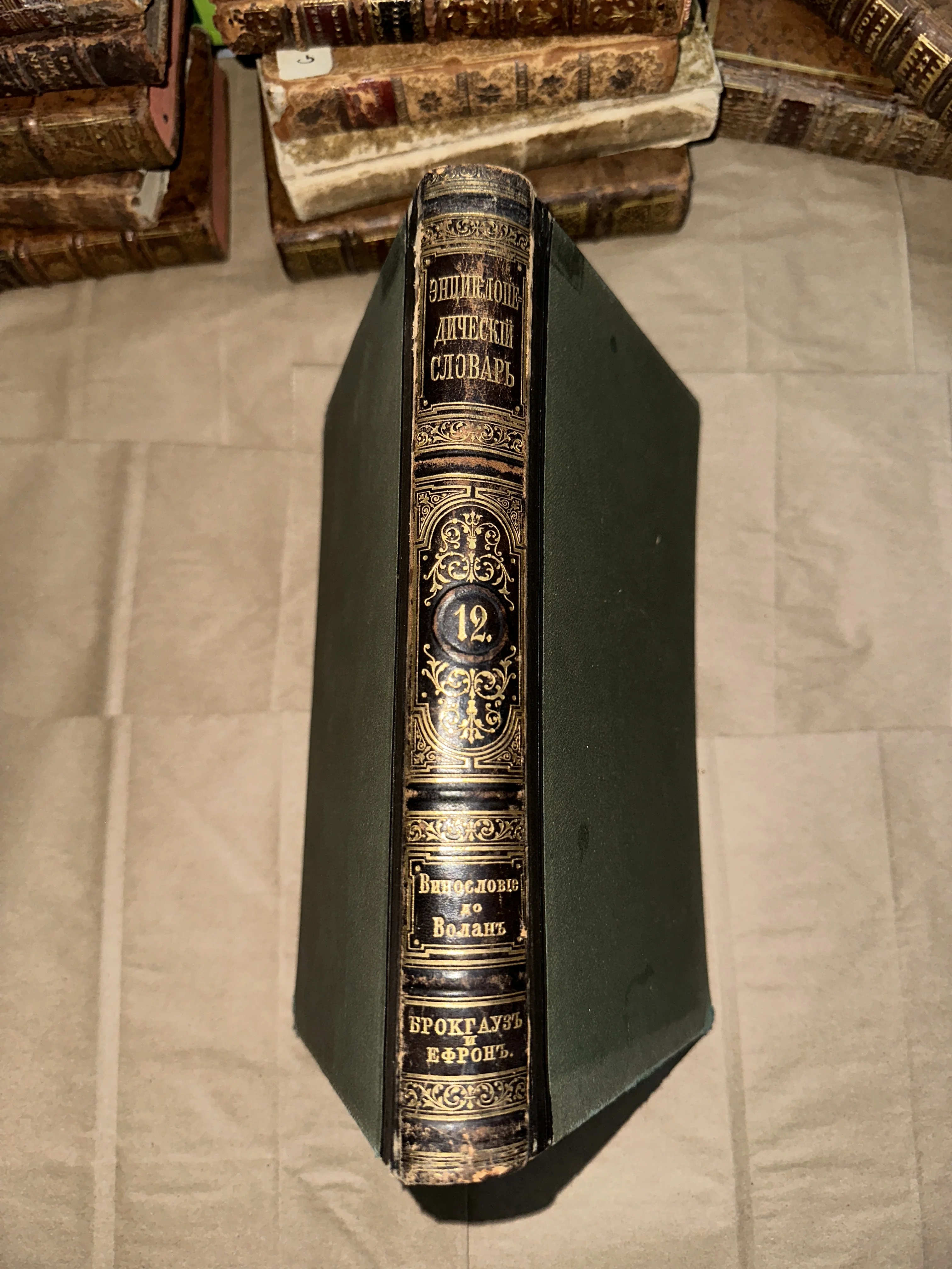 Корешок антикварной книги с золотым тиснением: Энциклопедический словарь Брокгауза и Ефрона, том 12, Винословие — Воланъ.