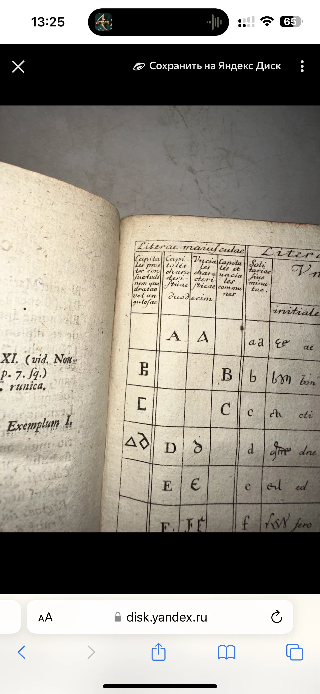 Этот редкий разворот представляет собой детальную палеографическую таблицу, сопоставляющую различные стили начертания литер — от классической латыни до загадочных рун. Пожелтевшая от времени бумага с выраженной текстурой и четкий типографский оттиск создают атмосферу серьезного научного труда XVIII-XIX веков. Идеальный экспонат для коллекции, посвященной истории письменности, каллиграфии или лингвистическим изысканиям прошлого.