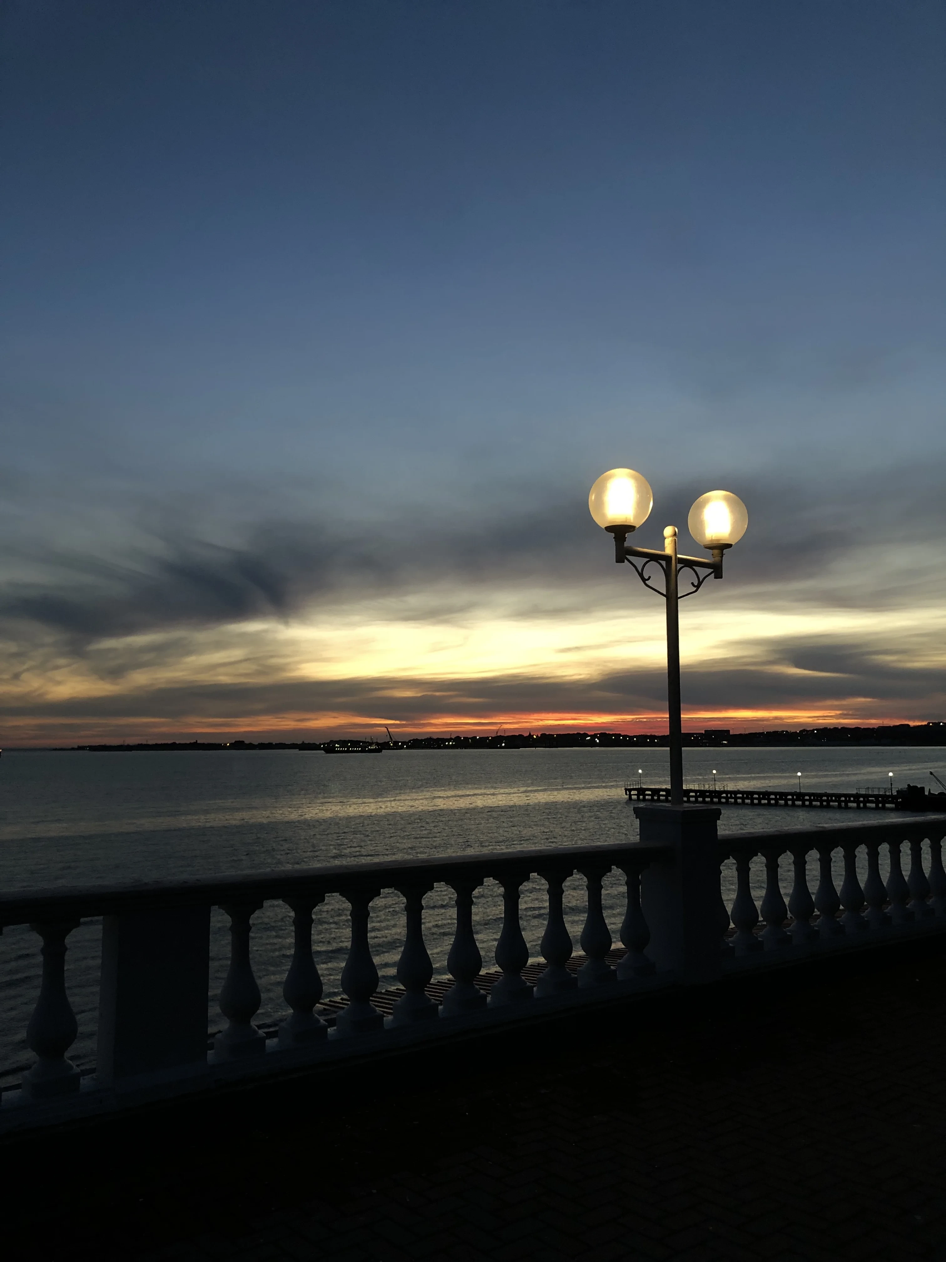 Уличный фонарь с двумя светящимися плафонами на фоне морского заката и каменной балюстрады.