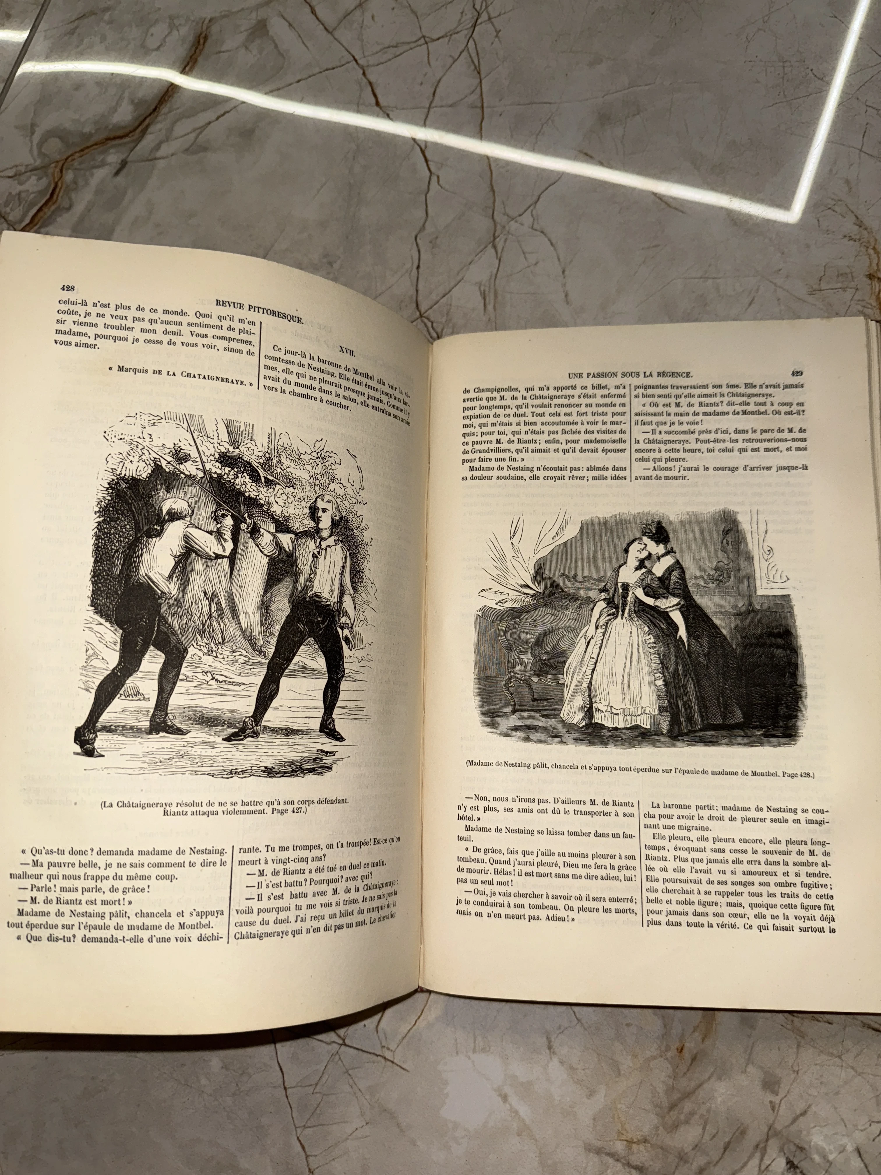 Изысканный образец французской книжной графики XIX века, повествующий о драматических событиях эпохи Регентства. Детализированные гравюры и классическая типографика на пожелтевшей от времени бумаге создают неповторимую атмосферу исторического романа. Этот экземпляр станет ценным дополнением к коллекции антикварной литературы и старинных иллюстраций.